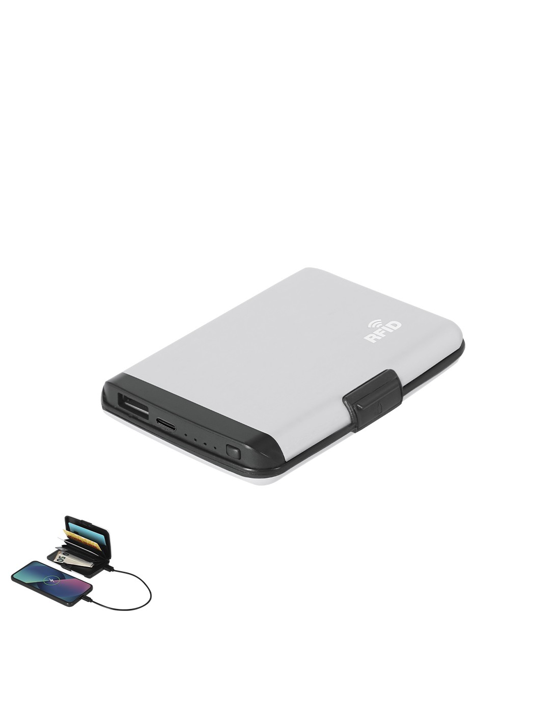 Tarjetero PowerBank fabricado en elegante Aluminio. Con 5 compartimentos, cierre de seguridad y sistema de protección RFID, diseñado para bloquear accesos no autorizados a tarjetas contactless. Cuenta con funcionalidad de batería auxiliar con capacidad de 2000 mAh. Salida y entrada en tipo C, cable incluido. Incluye distintivo logotipo RFID.