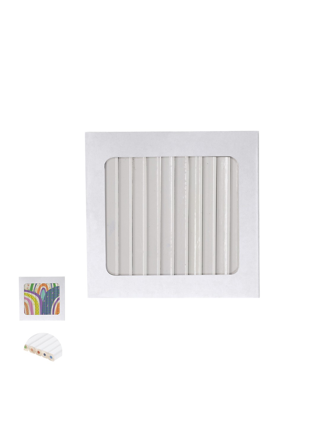 Cajas de12 lápices de madera acabado blanco, con cuerpo hexagonal y minas en varios colores. Presentados en estuche de cartón con cierre de solapa. Diseñado especialmente para grabado digital.