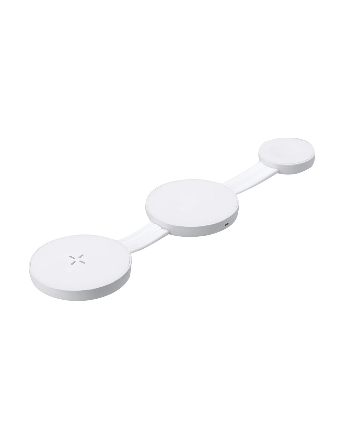 Cargador inalámbrico magnético 3 en 1 de 15W, fabricado en ABS. Diseñado para la carga simultánea del smartphone, auriculares y smartwatch y de tamaño ultra compacto. Un gadget todo en uno: plegable, portátil, muy versátil y de diseño funcional. Conexión por usb Tipo C -cable incluido-.