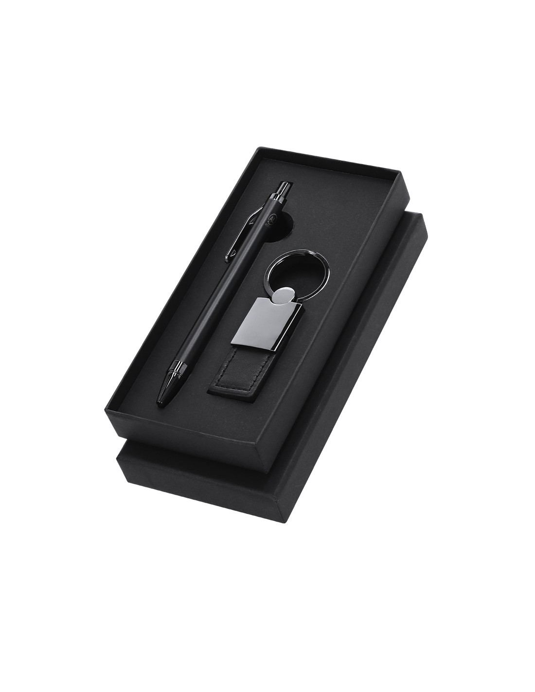 Elegante set premium que incluye:Bolígrafo en Aluminio Reciclado de acabado negro mate, de mecanismo pulsador y tinta azul. Con clip y puntera en pulido ABS. Incluye distintivo Aluminio reciclado.Elegante llavero con cinta fabricada en poliéster PU y accesorios cromados.