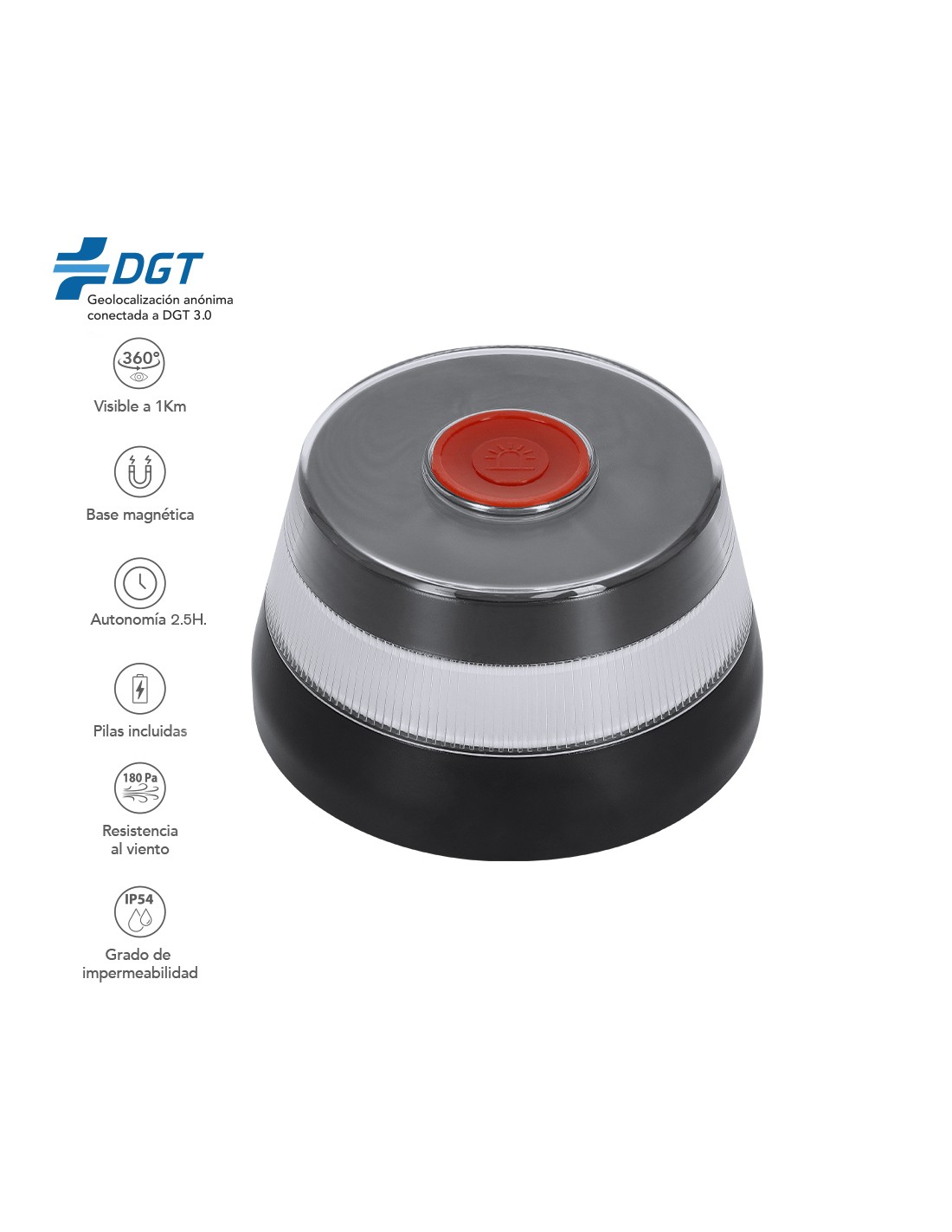 Luz de emergencia V16 Geolocalizada para vehículos. Fabricada conforme a la normativa de seguridad vigente y homologada por laboratorio acreditado IDIADA, según requisitos de la DGT , con número de homologación marcado en la parte inferior del artículo. Incluye una tarjeta SIM conectada con Telefónica Tech, con servicio de comunicación de datos hasta 12/2038, sin gastos ni cuotas adicionales. De activación manual y con base de fijación magnética. Resistencia al viento de hasta 180Pa, visibilidad 360° -hasta 1 km de distancia- y resistencia al agua conforme a estándares IP54. De tamaño compacto para guardar en cualquier compartimento del vehículo y tenerla a mano en caso de emergencia. Presentada en caja individual de diseño. Manual incluido (español e inglés). Alimentación a pilas (3xAA pilas alcalinas incluidas), con una autonomía de 2.5 horas.