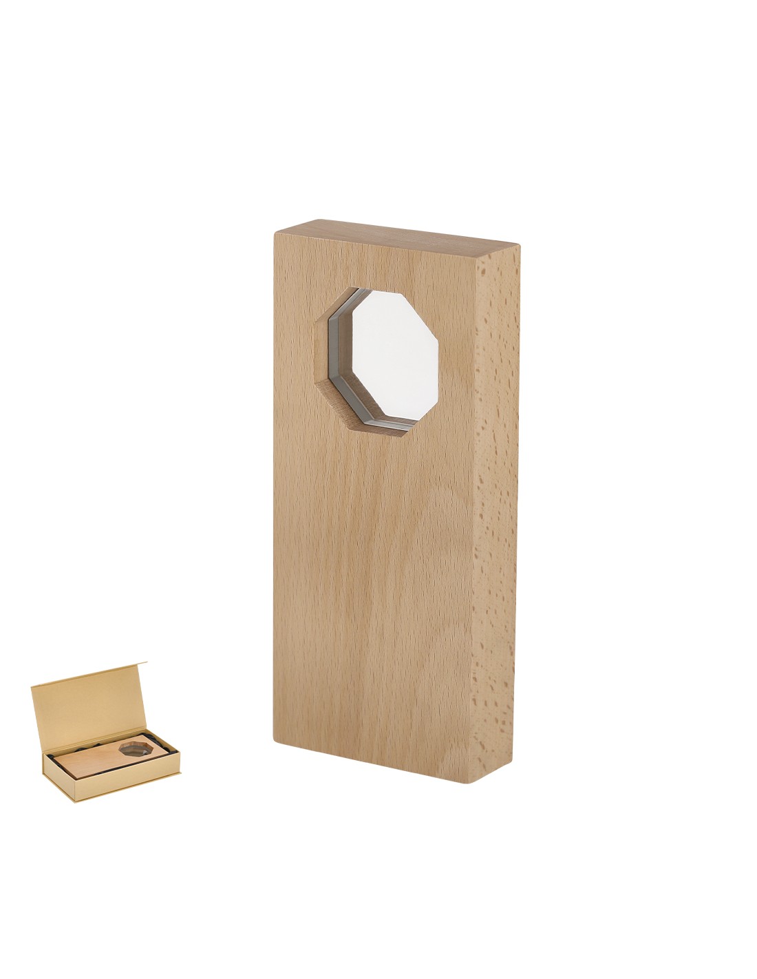 Placa trofeo con diseño de madera y en centro placa de cristal de diseño octogonal. Ideal para regalos personalizados, reconocimientos, premios y decoración.