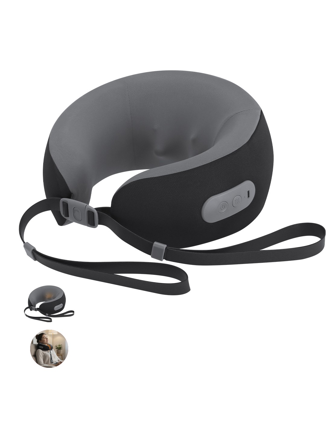 Almohadilla masajeador portátil para cuello. Máxima experiencia de confort para cualquier viaje gracias a la función de masajes. Tiene cierres de hebilla para un correcto y cómodo ajuste. Incluye botón de ON/OFF/SWITCH con indicador de luz. Con funda confeccionada en poliéster para protegerla en el transporte. Equipada con batería recargable de 1.200 mAh, con entrada TipoC.