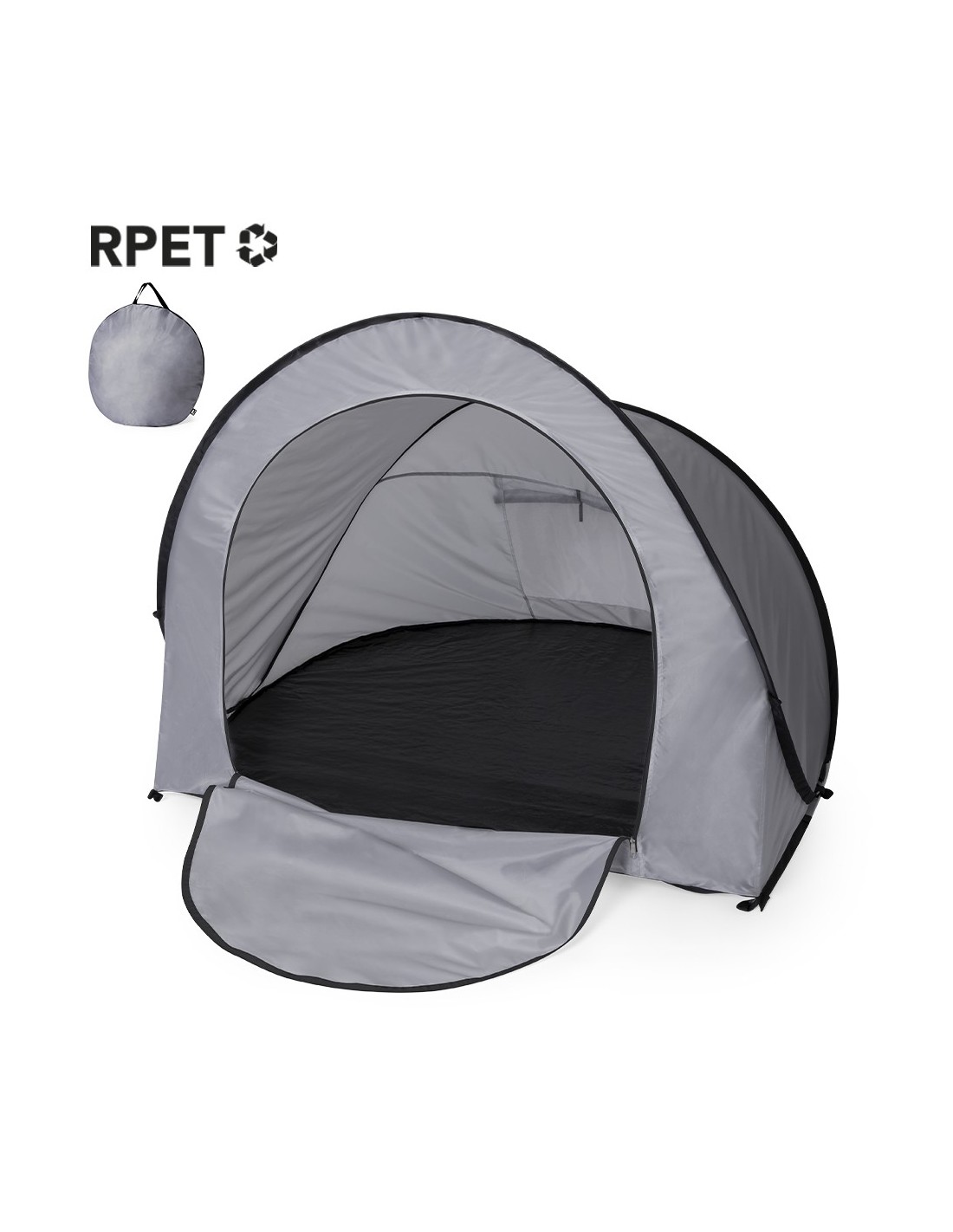 Tienda de campaña automontable, solo hay que sacarla de la funda y se despliega automáticamente. Fabricada en resistente poliéster RPET, con estructura metálica y detalles en color negro. Amplia puerta de entrada, con cierre de cremallera de doble tirador interior y exterior. Ventana en parte posterior con mosquitera, cierre de velcro y cortina enrollable con cordón y cinta de sujeción. Ideal para 2 personas y de fácil plegado. Presentada en funda a juego, con distintivo RPET en etiqueta exterior. El material RPET se elabora a partir de plástico reciclado, para así fomentar la reutilización de residuos plásticos y ayudar a la sostenibilidad del planeta.