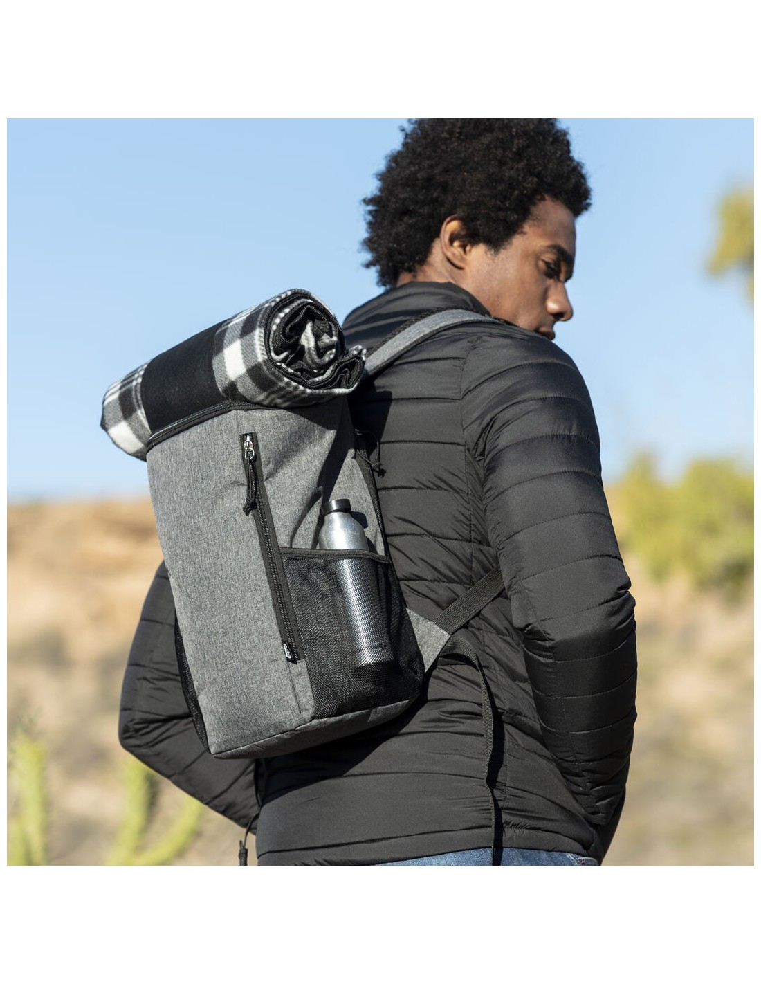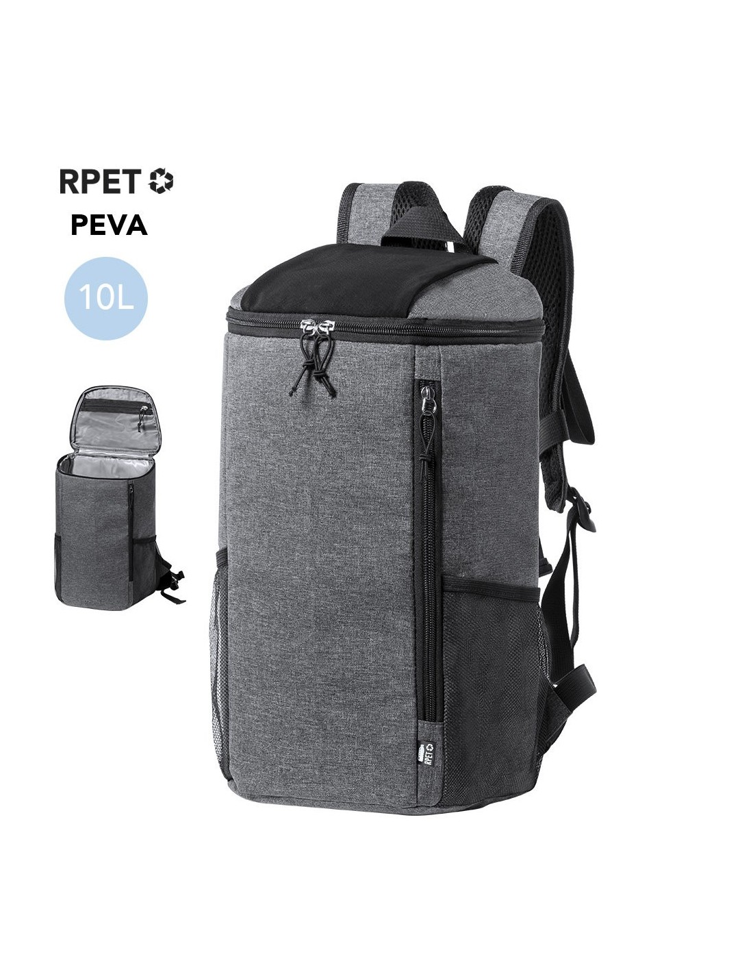 Mochila nevera 10L de línea nature, fabricada en resistente poliéster RPET 600D de alta calidad, elaborado a partir de plástico reciclado para así fomentar la reutilización de residuos plásticos y contribuir a la sostenibilidad del planeta. Compartimento principal con cierre de cremallera de doble tirador, con interior en PEVA. Con bolsillos laterales en redecilla y bolsillo frontal de acceso rápido con cierre de cremallera y tirador. Banda elástica en la parte superior, y en bolsillo en la parte trasera.Totalmente acolchada. Distintivo RPET en etiqueta.