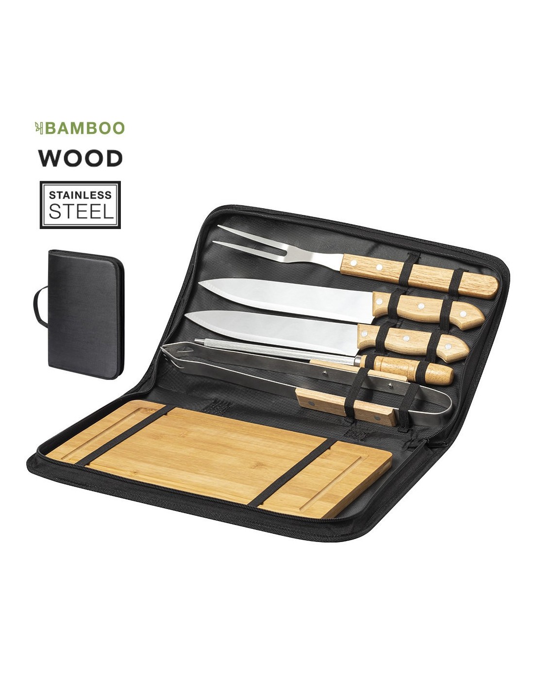 Set de barbacoa de línea nature y 6 accesorios fabricados en metal con mango de madera. Incluye 2 cuchillos, afilador, trinchador y pinzas, con tabla de bambú para corte y presentación. Presentado en estuche indvidual de resistente poliéster, con sujeciones elásticas interiores para los distintos utensilios.