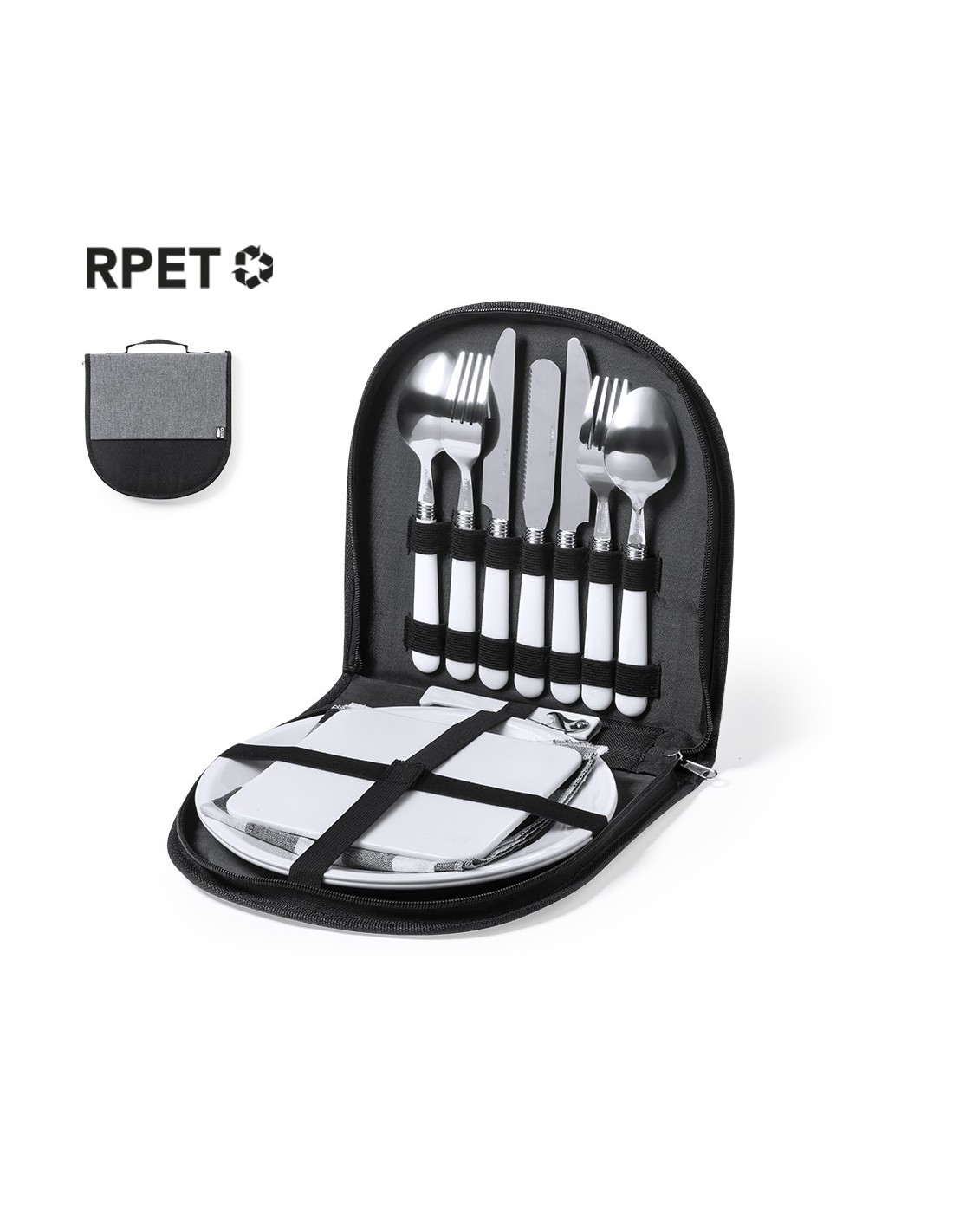 Original set de picnic de 2 servicios. Presentado en resistente funda 600D RPET, con cierre de cremallera, asa de transporte y etiqueta exterior con distintivo RPET. Interior reforzado, con compartimentos para los diferentes accesorios. Contenido: 2 cucharas, 2 cuchillos y 2 tenedores en acero inox con mango en PP blanco 2 platos en PP blanco de 23 cm de diámetro. 2 servilletas en tela de 29 x 29 cm. Con diseño retro en patrón a cuadros y en combinación tonos negros, grises y blancos. Tabla de corte y presentación de 15 x 15 cm, en PP blanco. El material RPET de la funda se elabora a partir de plástico reciclado, para así fomentar la reutilización de residuos plásticos y ayudar a la sostenibilidad del planeta.