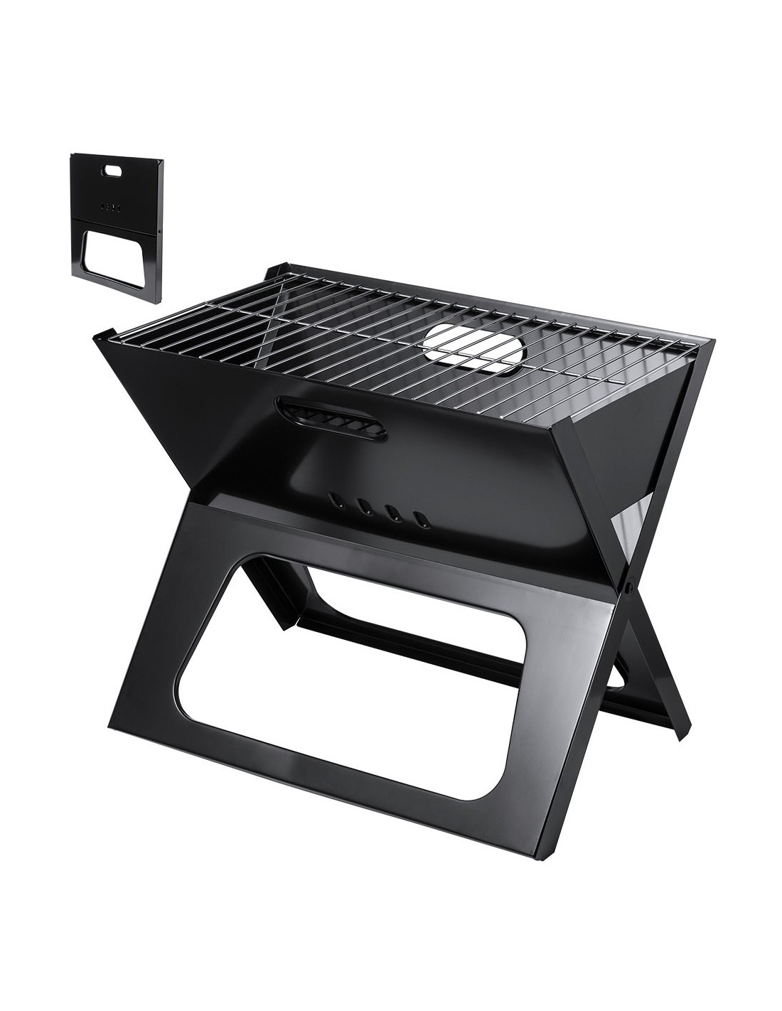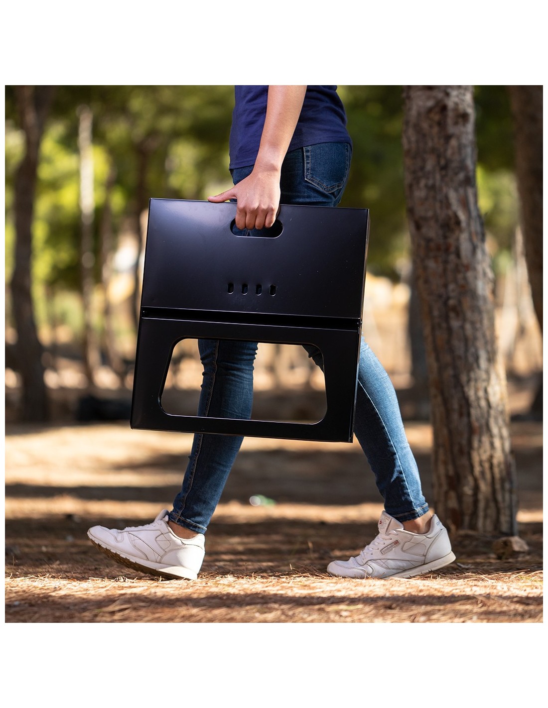 Barbacoa plegable fabricada en resistente metal de acabado en negro. Con cómodas asas y parrilla, de fácil plegado y tamaño compacto. Presentada en atractiva caja individual de diseño.