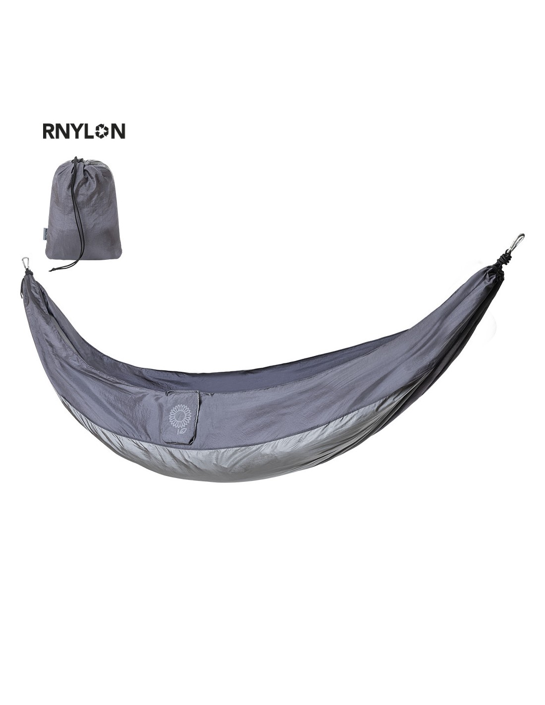Hamaca fabricada en resistente nylon reciclado de 270x140cm, resultado de la utilización de los desechos pre y post-consumer del nailon, que se reutilizan para obtener este nuevo material, sin alterar sus propiedades y cumpliendo con los principios de las 3R (Reduce, Reutiliza, Recicla). Con resistentes cintas de amarre y mosquetones metálicos. Soporta hasta 200kg. Presentación plegado, con cinta ajustable mediante regulador. Manual de montaje incluido.