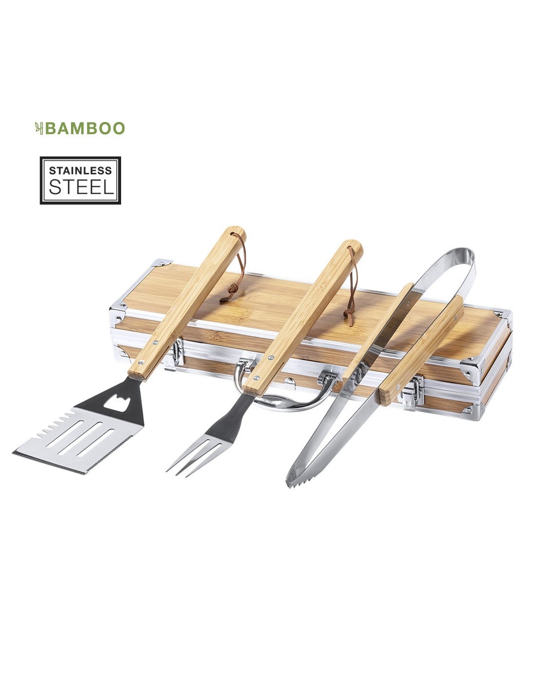 Set de barbacoa de línea nature y 3 accesorios fabricados en metal con mango de bambú. Incluye paleta con abridor, trinchador y pinzas. Presentado en estuche imitación bambú, con terminaciones en metal. Presentado en atractiva caja individual de diseño eco.