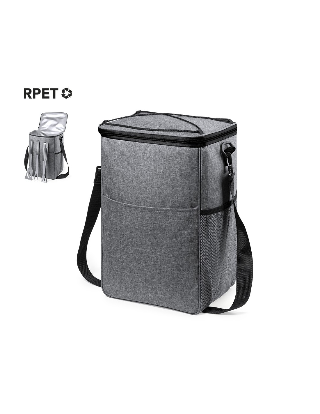 Set de barbacoa con 3 accesorios. Incluye: Bolsa de transporte/nevera fabricada en resistente poliéster RPET 300D, elaborado a partir de plástico reciclado, para así fomentar la reutilización de residuos plásticos y ayudar a la sostenibilidad del planeta. Con cinta para hombro ajustable de cierre de mosquetón e interior isotermo en PEVA, para conservar la temperatura de los alimentos. Distintivo RPET en etiqueta etiqueta exterior.Paleta, pinzas y trinchador metálicos, con mangos en color negro.