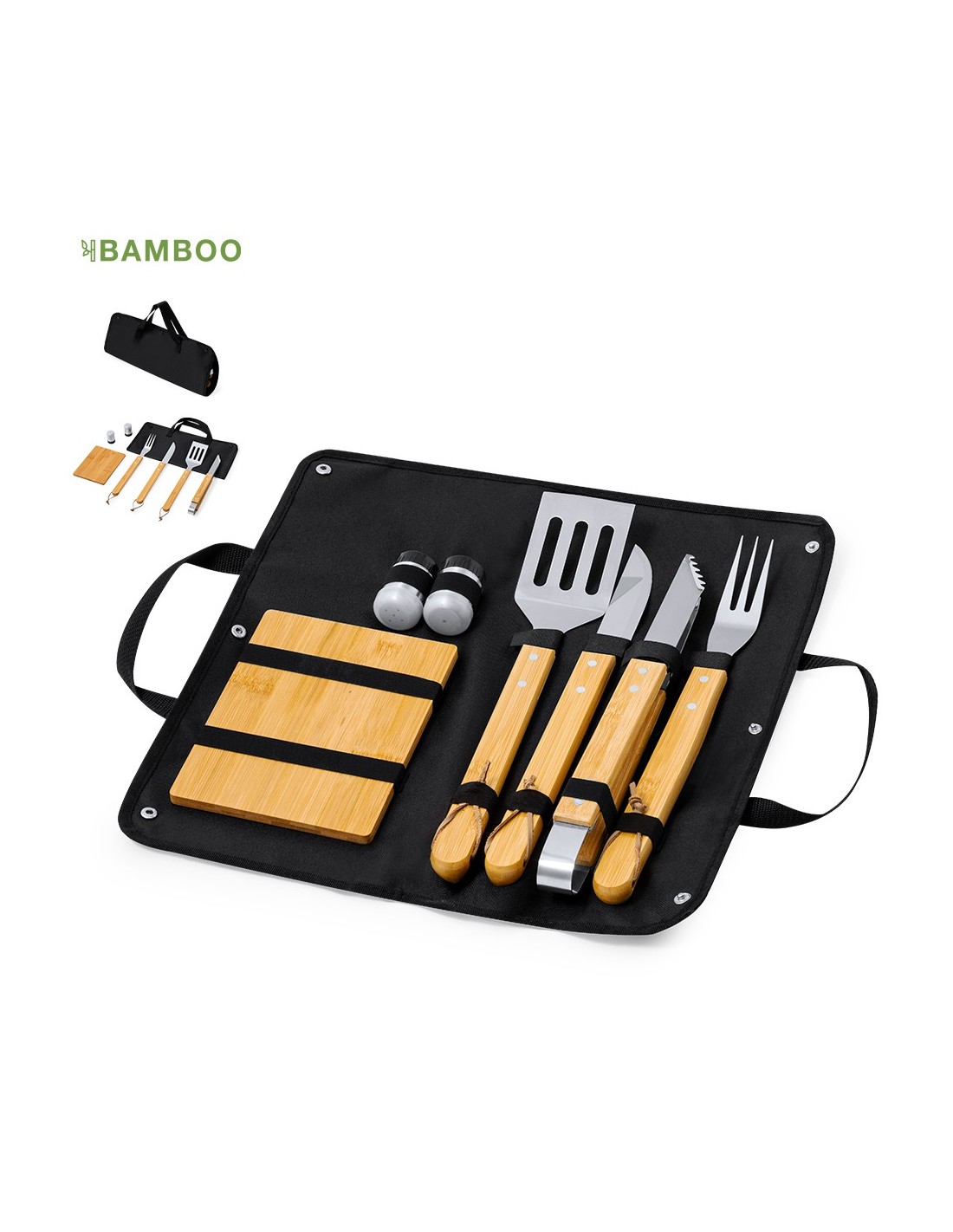 Set de barbacoa elaborado en bambú y acero inox. Este conjunto incluye 7 accesorios de metal con mangos de bambú: 1 cuchillo, trinchador, pinzas, espátula, salero y pimentero, junto con una tabla de bambú para corte y presentación. El set se presenta de manera elegante en un estuche individual fabricado en resistente poliéster, con sujeciones elásticas interiores para los distintos utensilios..Materiales como el bambú fomentan la utilización de materias primas naturales, reduciendo las emisiones contaminantes. Proviene de una planta de gran resistencia y versatilidad, con crecimiento y regeneración rápidos, siendo una excelente alternativa al uso de madera tradicional.