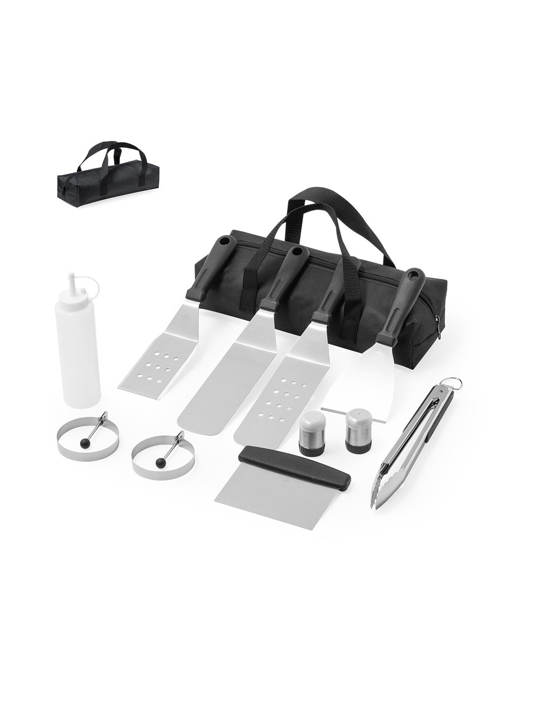 Set de barbacoa fabricado en acero inox. Consta de 11 accesorios, entre ellos: 1 espátula lisa, 2 espátulas con agujeros, 1 raspadora, 1 pinza, 1 espátula, 1 salero, 1 pimentero, 1 bidón con dosificador y 2 moldes redondos. Todo se presenta de manera organizada en un práctico macuto con cierre de cremallera y asas para facilitar su transporte. Presentado individualmente en bolsa reciclada.