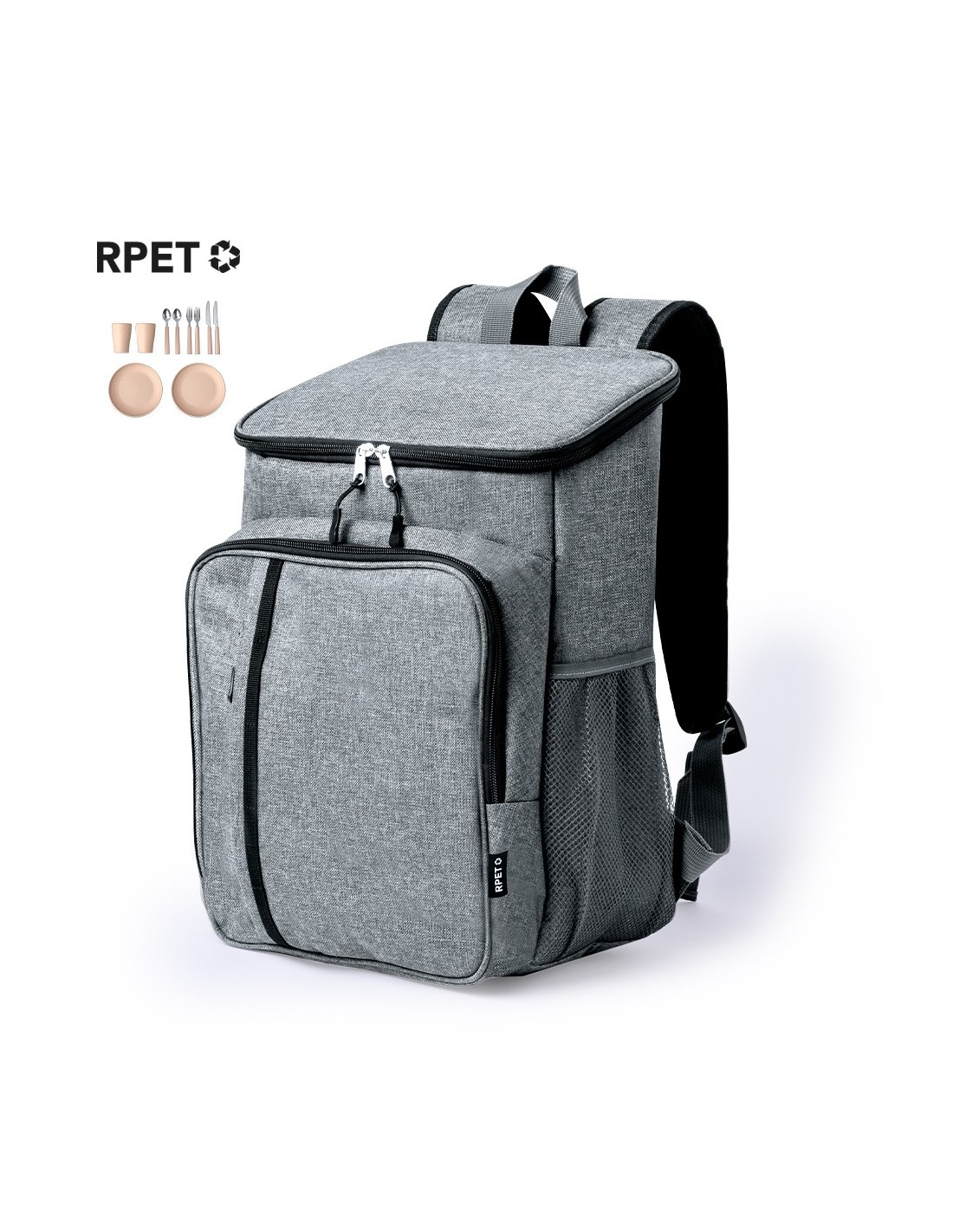 Mochila nevera para picnic confeccionada en resistente RPET 600D de alta calidad. Diseñada para 2 personas, cuenta con un bolsillo independiente para un almacenaje seguro. Incluye 2 vasos, 2 cuchillos, 2 cucharas, 2 tenedores y 2 platos. Además, presenta un bolsillo frontal de rápido acceso y bolsillos laterales de rejilla. El compartimento nevera tiene un interior en PEVA, y la mochila cuenta con una cómoda asa de transporte, cintas y parte trasera acolchadas. Logotipo RPET en etiqueta..El material RPET se elabora a partir de plástico reciclado, para así fomentar la reutilización de residuos plásticos y ayudar a la sostenibilidad del planeta.