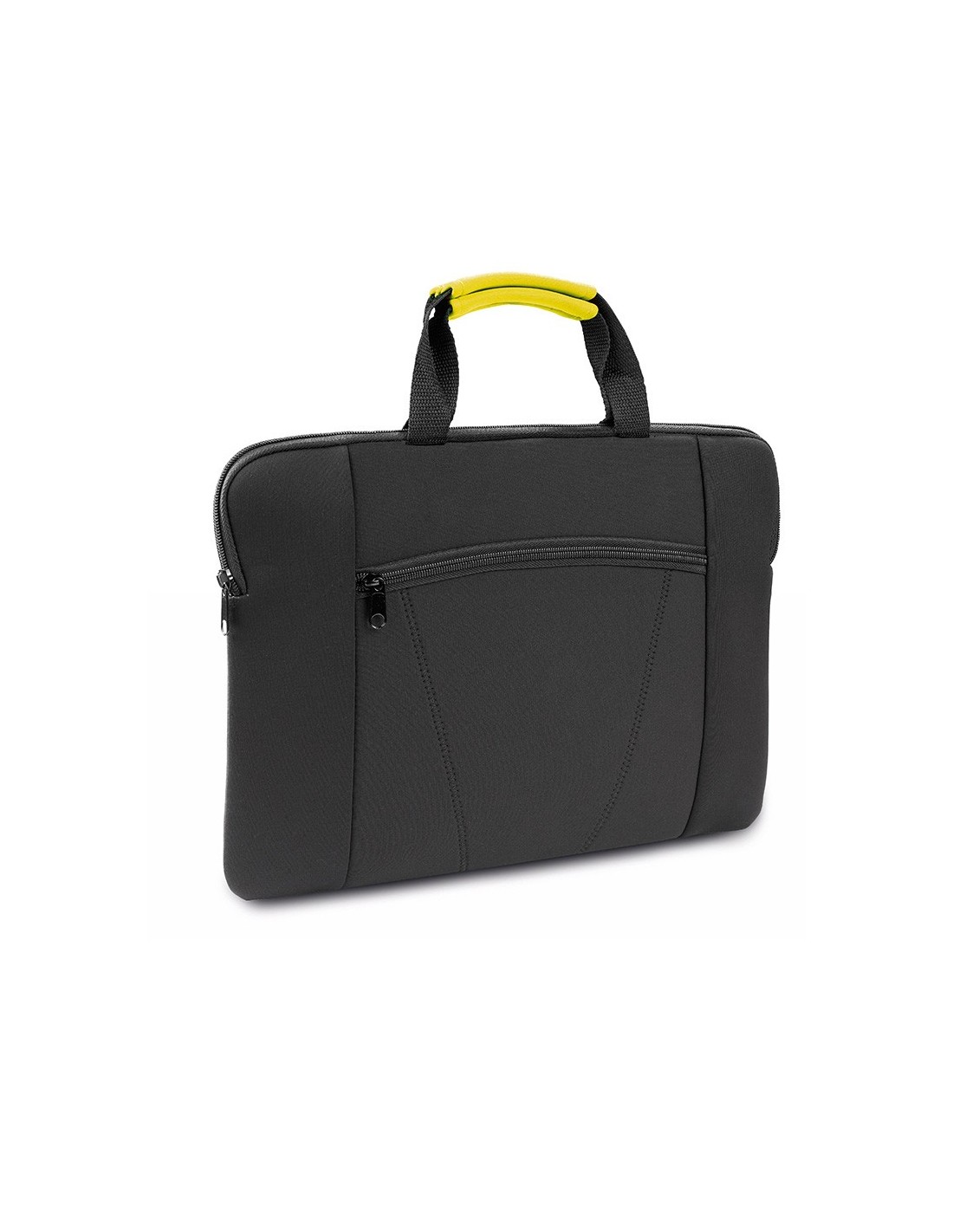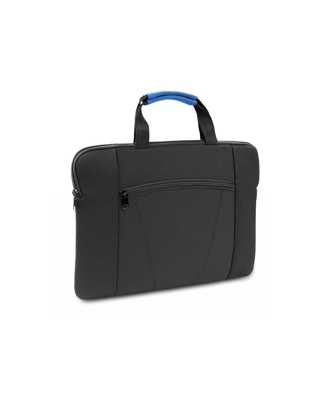 Resistente portadocumentos de soft shell con cierre de cremallera y bolsillo frontal. En elegante acabado de color negro y refuerzos en color en las asas.