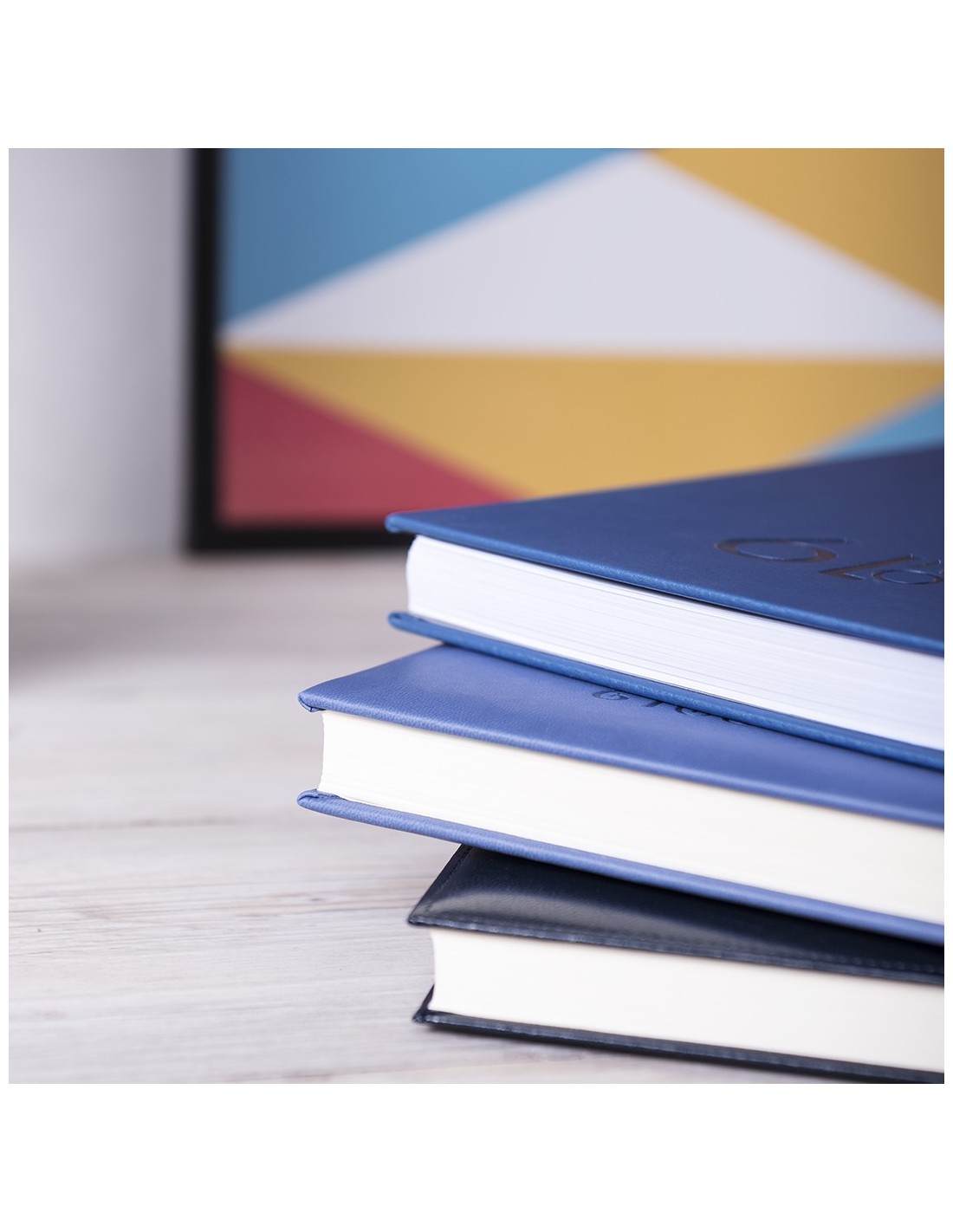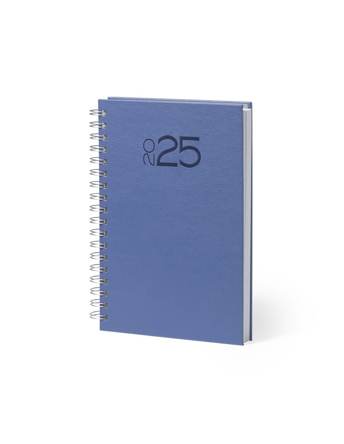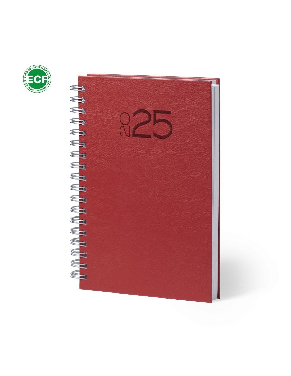 Agenda de anillas tamaño B5, acabada en resistente y suave polipiel de variados colores. Diseño página día con frase del día. En castellano, gallego, euskera y catalán. Presentada en caja individual.