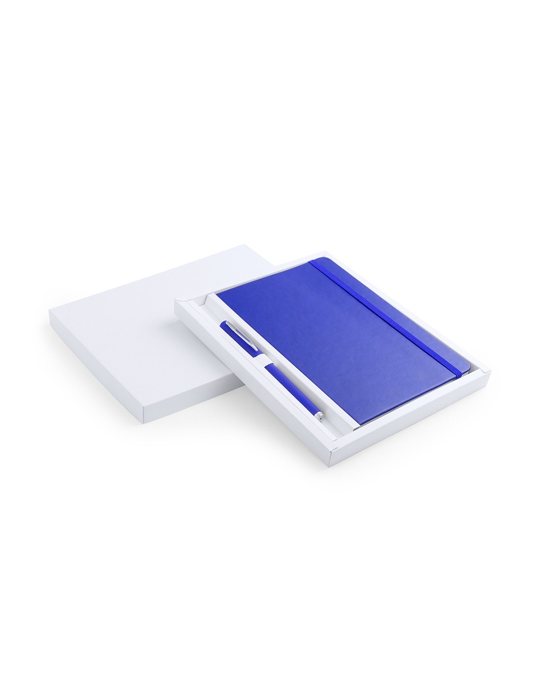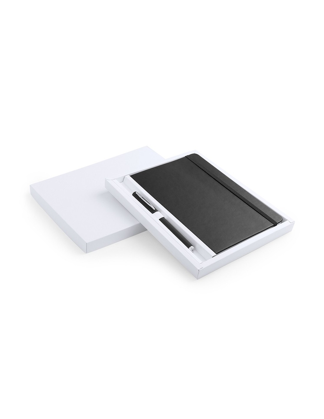 Set de bloc de notas con tapas de suave tacto acabadas en polipiel y bolígrafo de suave cuerpo a juego. De 100 hojas lisas con elástico de sujeción y marcapáginas de tela a juego. Presentado en elegante estuche de cartón blanco troquelado.