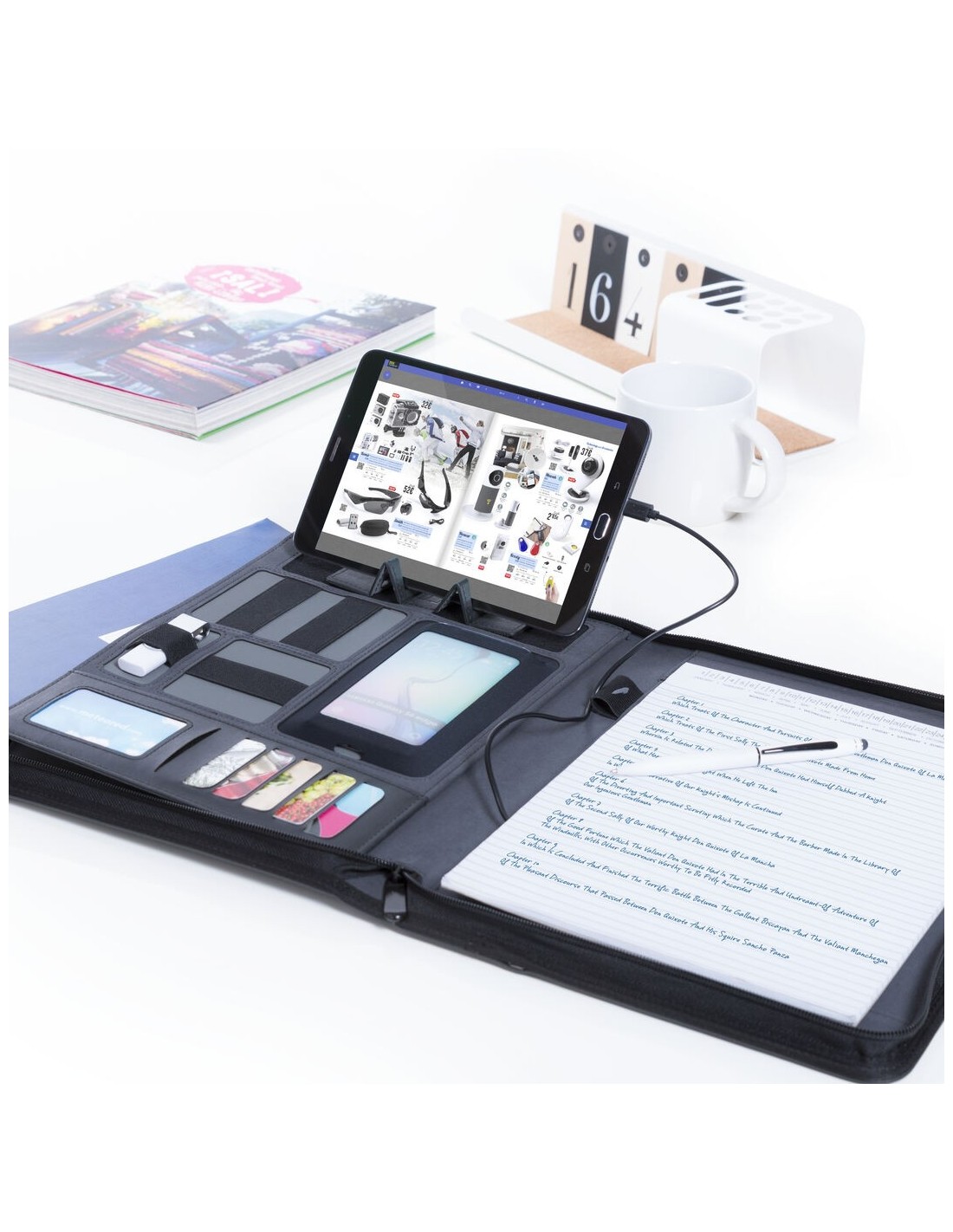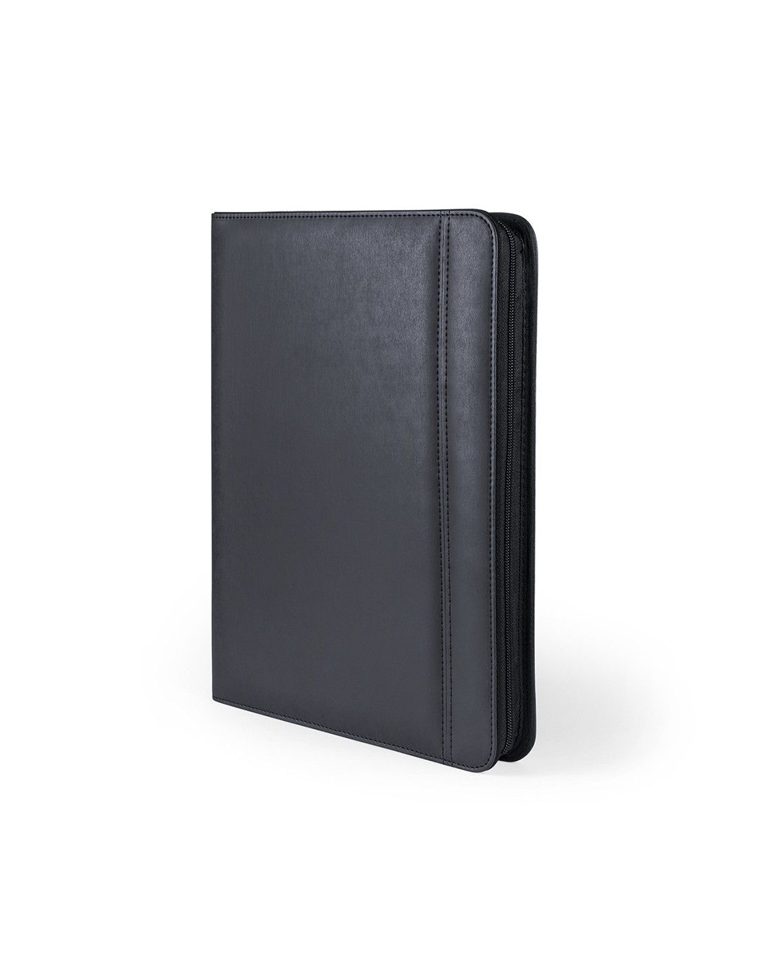 Carpeta de elegante y suave polipiel negra con batería auxiliar externa de gran capacidad de carga -5.000 mAh- integrada. De sobrio diseño y apertura de cremallera, con multitud de compartimentos para almacenar tarjetas de visita, memorias USB, además de