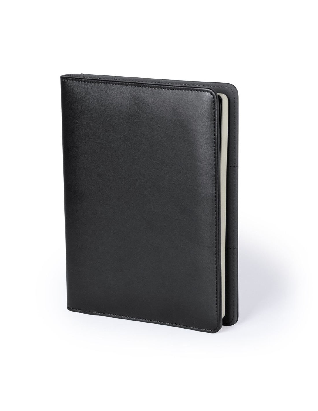 Elegante bloc de notas en polipiel con batería auxiliar externa de 3.000 mAh de capacidad de carga integrada. Incluye tarjetero, soporte para bolígrafo y soporte para smartphones y otros dispositivos móviles. El fácil acceso a la estación de carga mediant