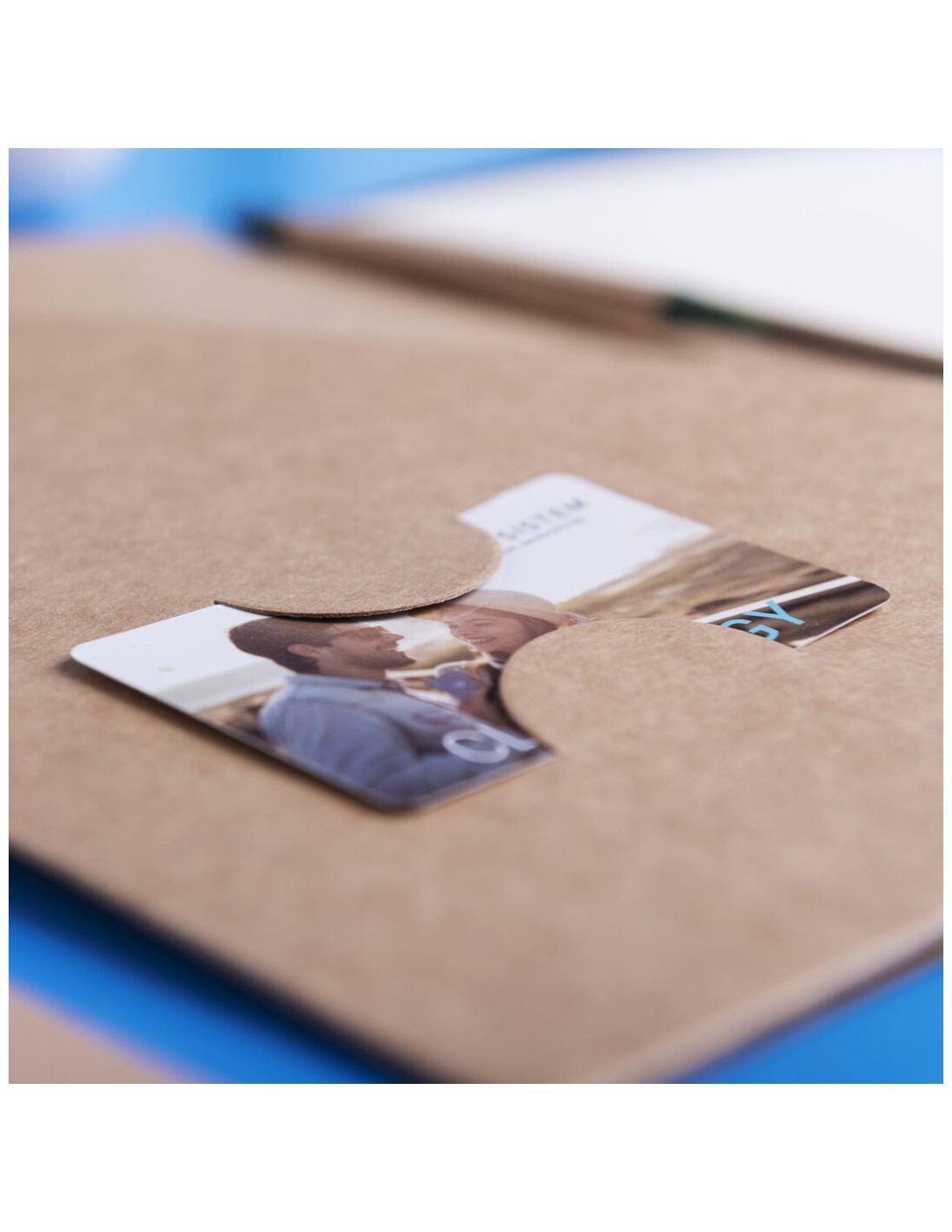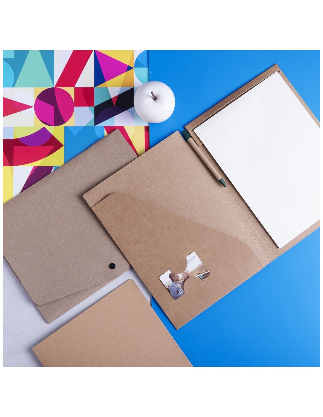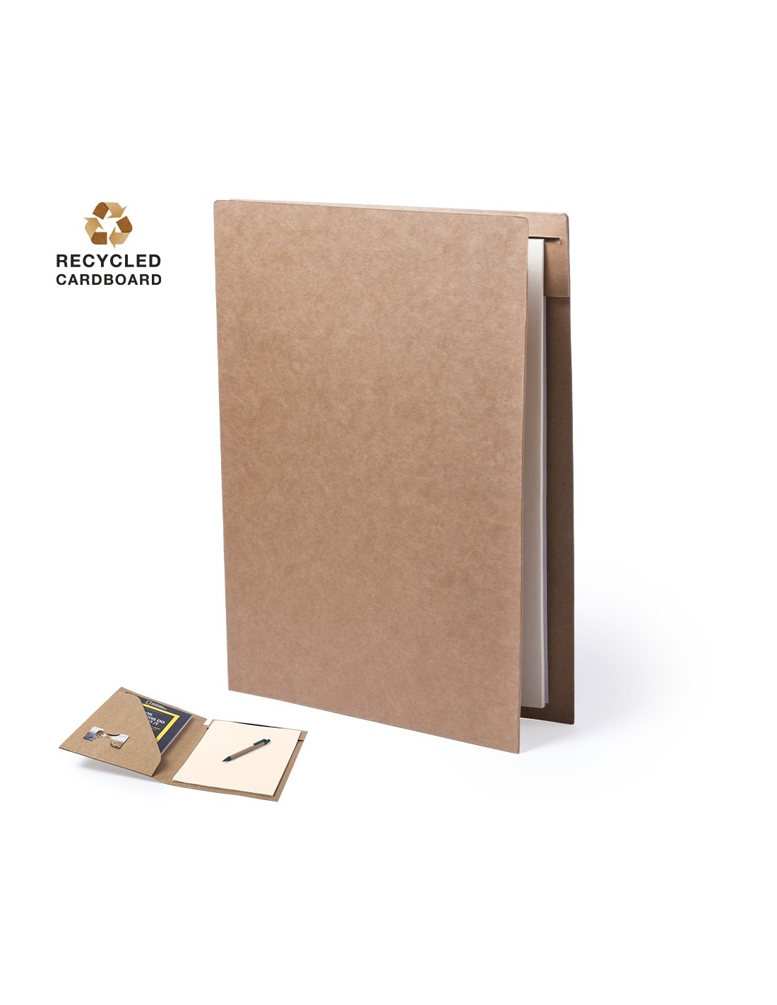 Carpeta en resistente cartón reciclado de acabado rígido con bolígrafo de cartón reciclado a juego incluido. Interior con bloc extraíble de 20 hojas lisas, bolsillo de solapa, tarjetero y soporte para bolígrafo.