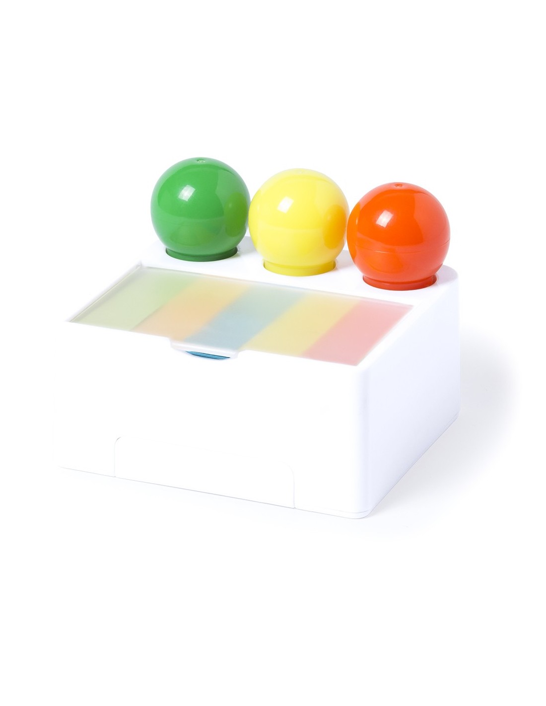 Set de marcadores con soporte para móvil integrado en base. De diseño minimalista en color blanco, incluye 3 marcadores fluorescentes de original diseño en esfera y 100 mini notas adhesivas en variada gama de colores. Presentado en caja individual.