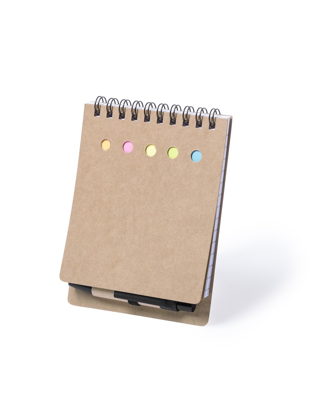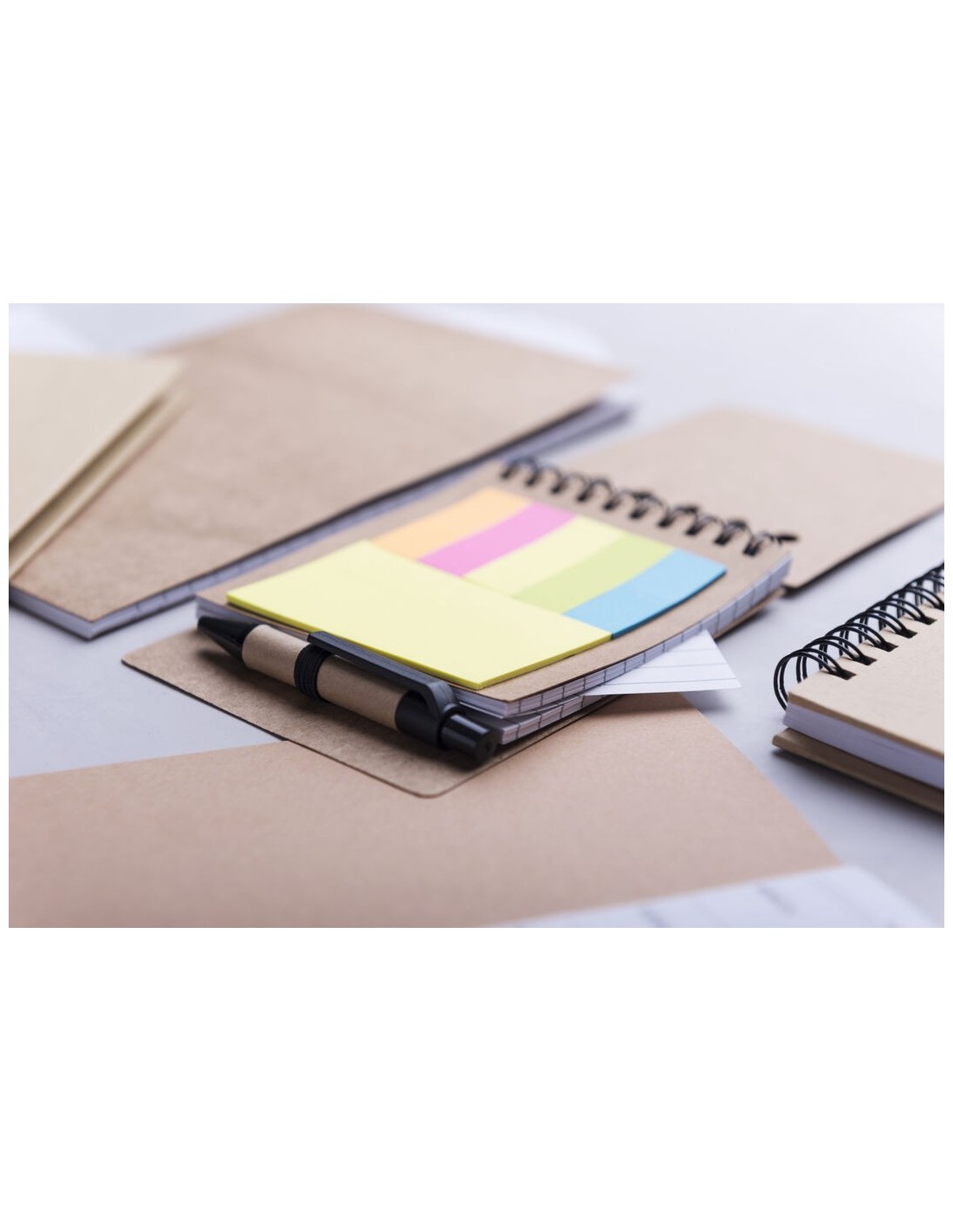 Bloc de notas adhesivas de anillas con bolígrafo de cartón reciclado incluido. Con tapas de suave tacto acabadas en resistente cartón reciclado rígido con troquelado. Con bloc de 50 hojas de distribución a una raya, 15 notas adhesivas grandes y 75 mini no