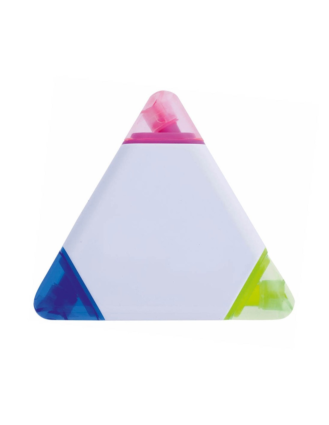 Original marcador fluorescente de tres colores con cuerpo triangular en suave acabado brillante de color blanco, especialmente diseñado para marcaje digital a todo color. Con capuchas translúcidas juego con marcador.
