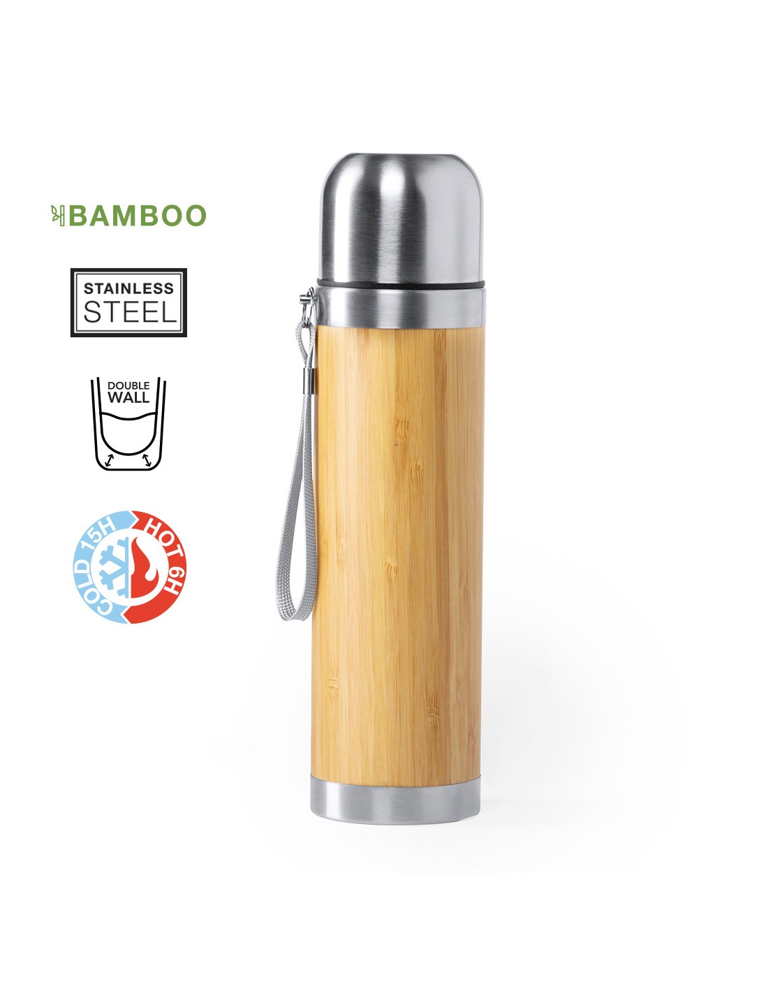 Termo de línea nature en combinación de materiales bambú y acero inox, libre de BPA. 420 ml de capacidad, con doble cobertura para mejor y más duradera conservación de la temperatura. Cierre a rosca, con tapón taza en acero inox y cómoda cinta de transporte. Presentado en atractiva caja de diseño eco.