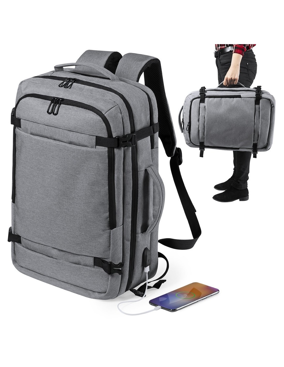 Mochila portadocumentos en resistente poliéster 600D de acabado denim. En diseño urbano, con bolsillo antirrobo, incluye conexión USB para carga de dispositivos móviles (cable incluido, batería auxiliar no incluida) y bolsillo acolchado para portátil de hasta 17 pulgadas. Refuerzos en fuelles con cierre de hebilla de seguridad y compartimentos con cierre de cremallera de doble tirador, con cintas de hombros y espalda acolchadas, de ajuste regulable. Accesorio para ajuste en trolley y bolsillo para ocultar las cintas de la espalda cuando se usa como portadocumentos.