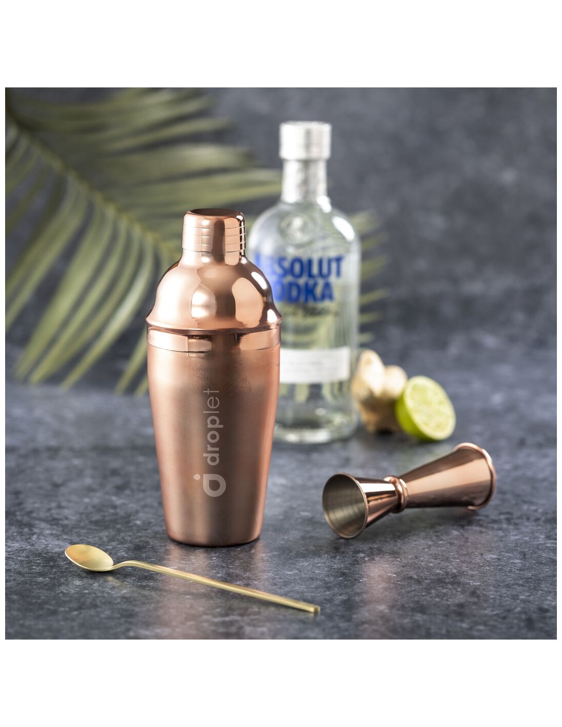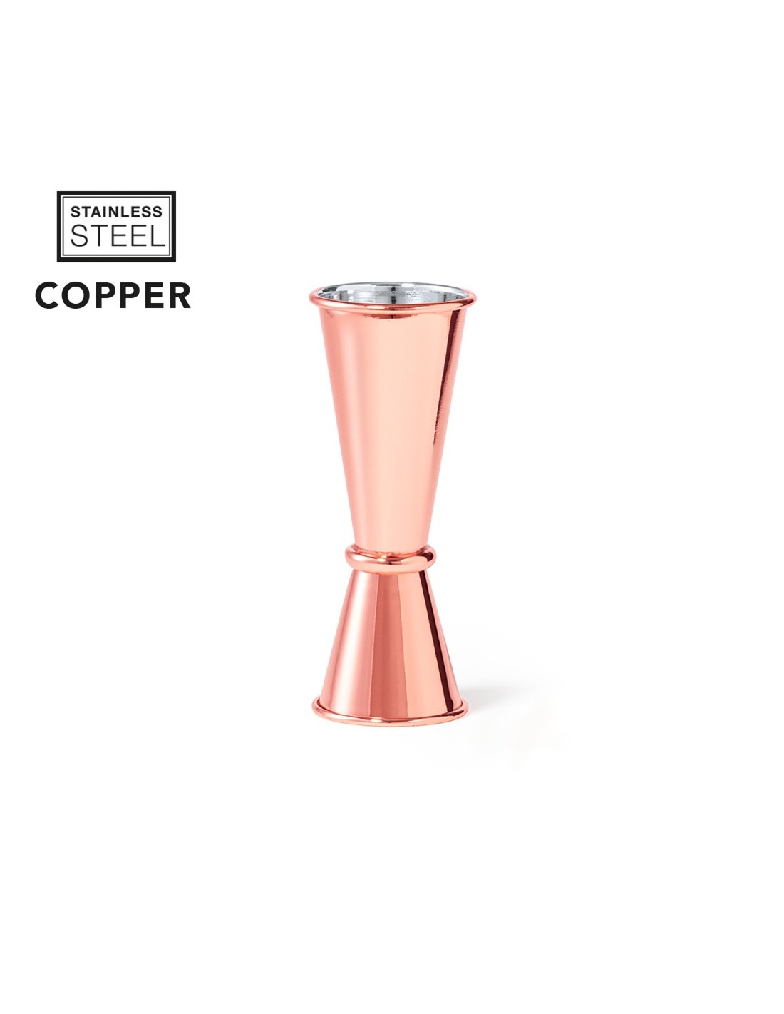 Medidor de bebidas fabricado en acero inox con recubrimiento exterior de cobre galvanizado. 2 dosificadores: sencillo 25ml y doble 50ml. Presentado en atractiva caja individual de diseño.