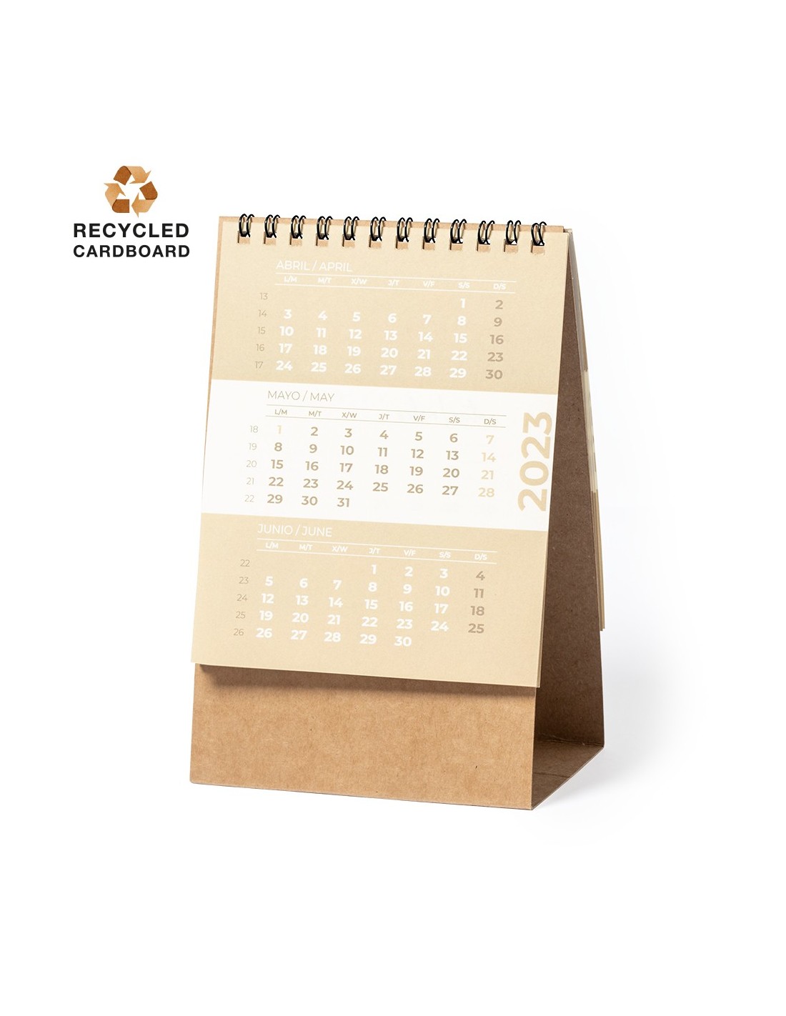Calendario de sobremesa de línea nature. Fabricado en cartón reciclado, con anillas en color negro. Diseño mes en curso/ mes anterior/ mes siguiente. Amplia superficie de marcaje en ambas caras.