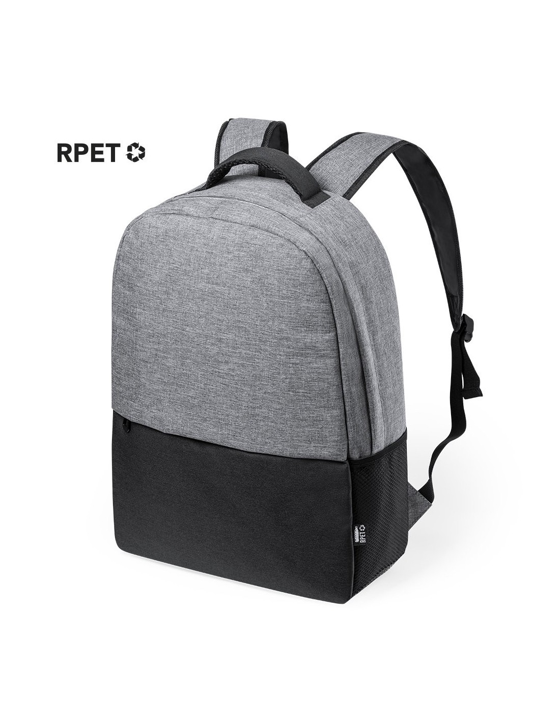 Mochila en resistente poliéster 600D RPET, elaborado a partir de plástico reciclado para así fomentar la reutilización de residuos plásticos y contribuir a la sostenibilidad del planeta. En elegante acabado bicolor, incluye etiqueta exterior con distintivo RPET. Bolsillo principal con compartimentos acolchados para ordenador portátil de hasta 15 pulgadas y tablet de hasta 10 pulgadas. Espalda y cintas acolchadas.