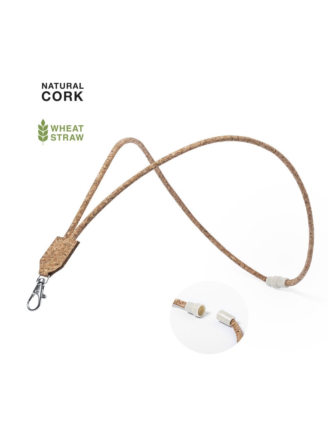 Lanyard de línea nature fabricado en corcho natural de acabado tubular. Con cierre de seguridad para cuello en caña de trigo/PP y mosquetón metálico. Incluye pastilla central en corcho para impresión.
