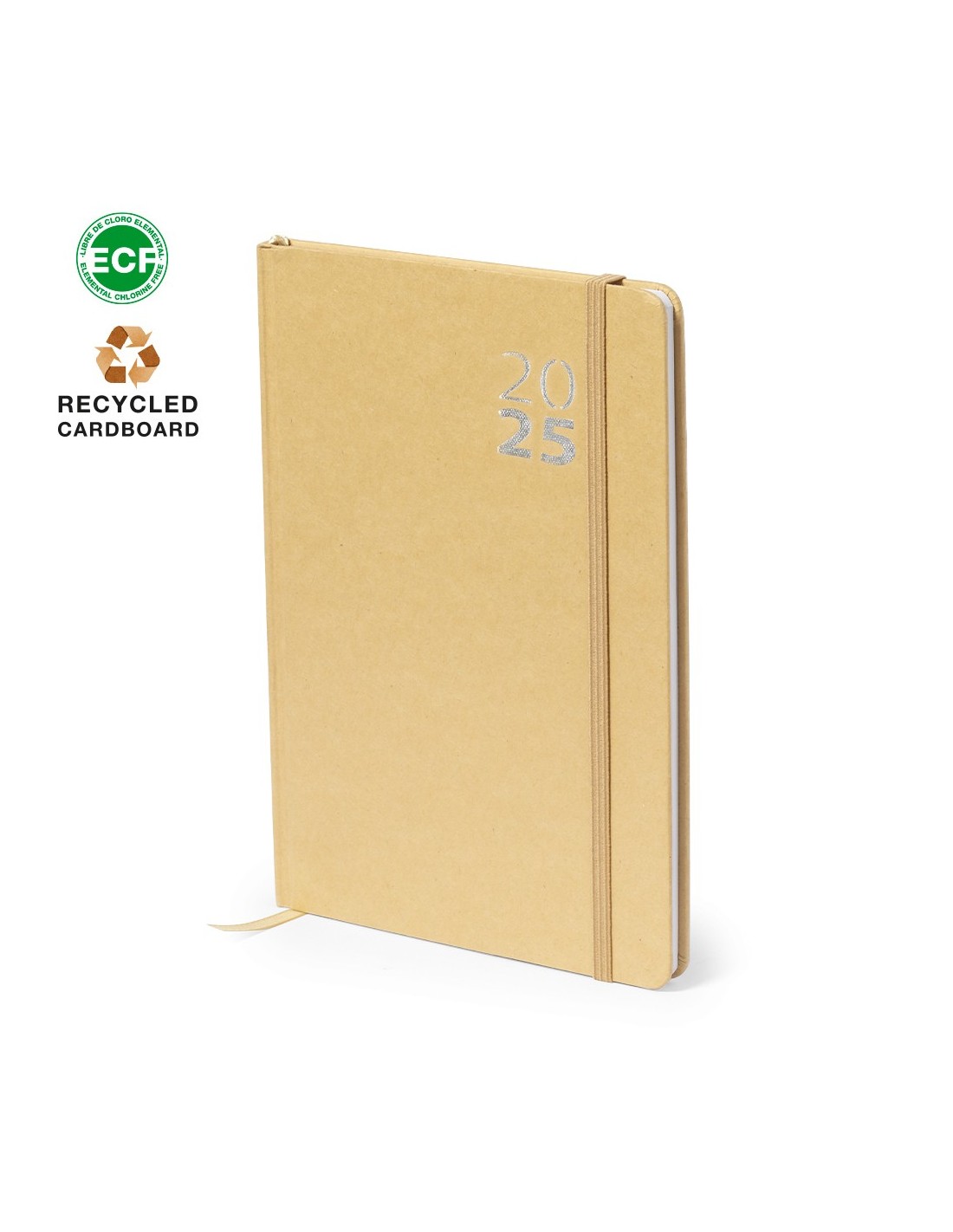 Agenda de tamaño A5 en cartón reciclado. Con cubiertas rígidas y elástico de cierre. Diseño semana vista, zona de anotaciones y marcapáginas de tela. En 2 idiomas: castellano e inglés. Presentada en caja kraft. El cartón reciclado proviene del reaprovechamiento de excedente de fabricaciones y reciclaje de papel en el final de su vida útil, convirtiéndose en un lienzo ecológico y sostenible.