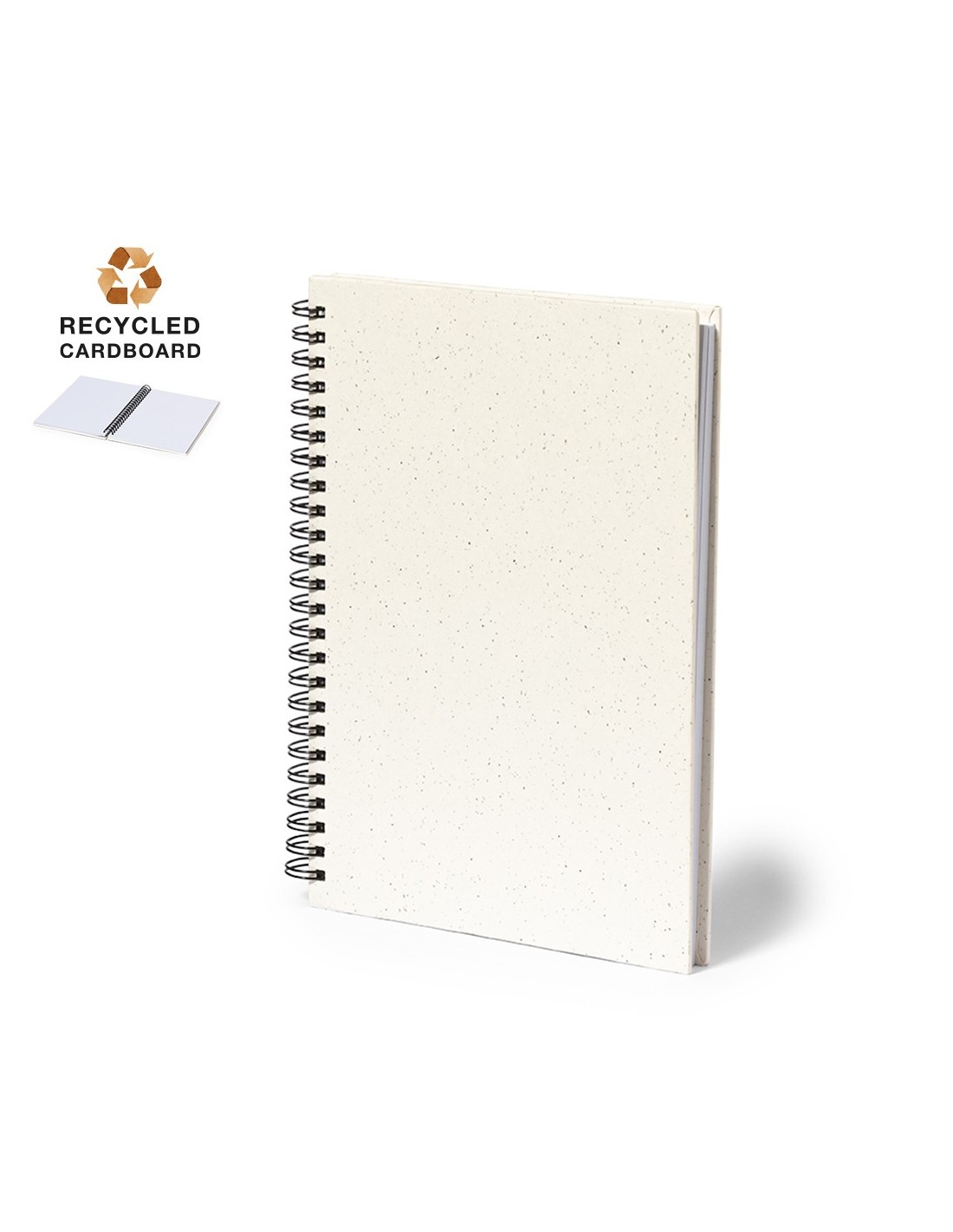 Libreta de anillas A5 con tapas duras en resistente cartón reciclado. Interior con 80 hojas blancas lisas y 100% recicladas microperforadas. Presentada en bolsa individual reciclada.