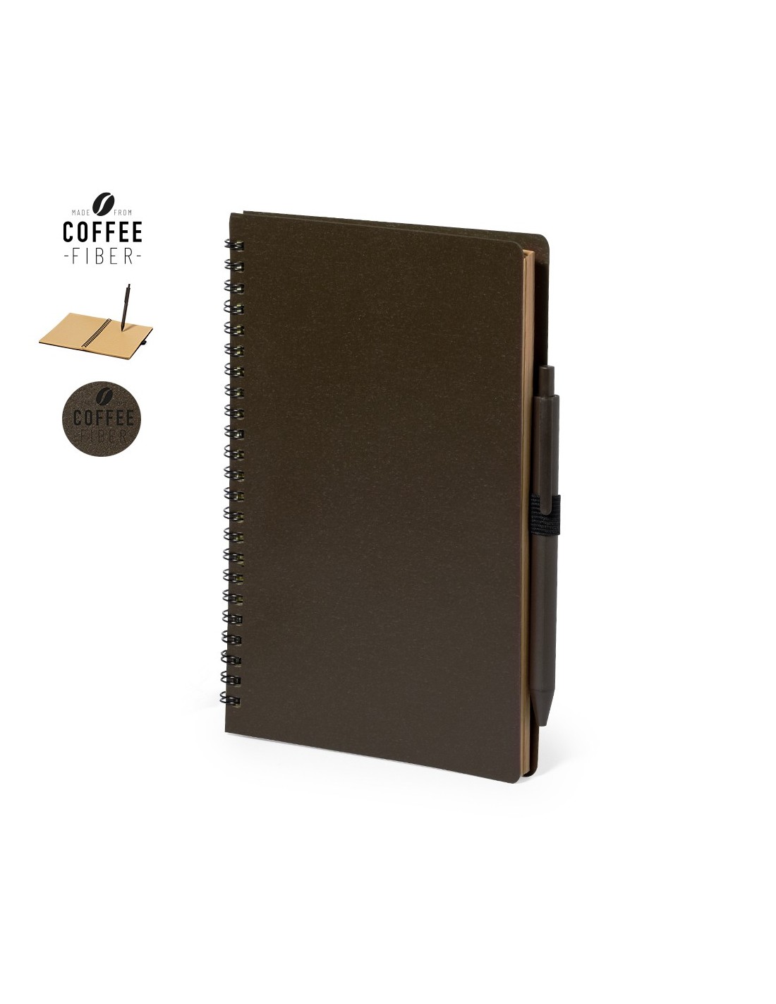Set de libreta y bolígrafo. Libreta de anillas con tapas fabricadas en suave fibra de café y soporte para el bolígrafo. De 80 hojas con diseño eco y disposición a una raya. Bolígrafo de mecanismo pulsador, con cuerpo en fibra de café y tinta azul. Incluye distintivo fibra de café impreso en libreta y bolígrafo. Presentado en bolsa individual reciclada. La fibra de café se elaborada a partir de los residuos producidos en la obtención del café. Una alternativa sostenible que favorece la reducción del uso de plásticos, ahorrando energía en el proceso de fabricación y fomentando así el cuidado del medio ambiente.