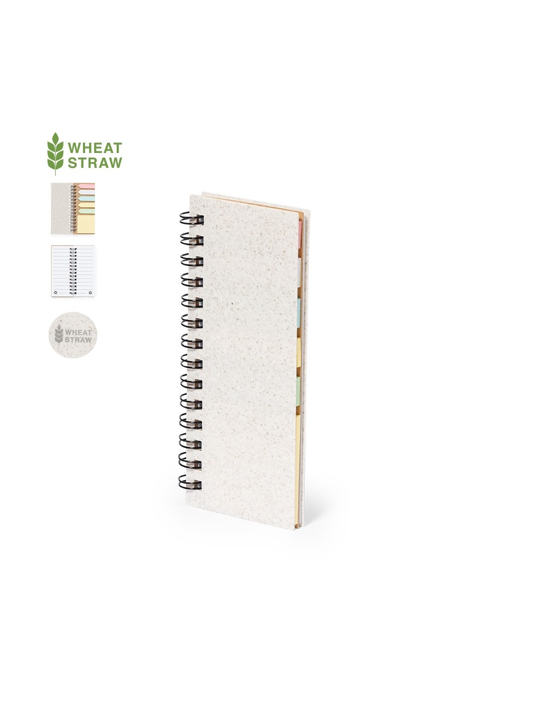 Bloc de notas con tapas en fibra de trigo. Con distintivo wheat straw en la contraportada. Incluye: Bloc de anillas de 30 hojas blancas con disposición a una raya y distintivo reciclado por ambas caras. 25 notas adhesivas medianas. 125 mininotas adhesivas en varios colores. Elaborado con elementos vegetales para así fomentar la utilización de materias primas naturales y reducir las emisiones contaminantes. Presentado en bolsa individual reciclada.