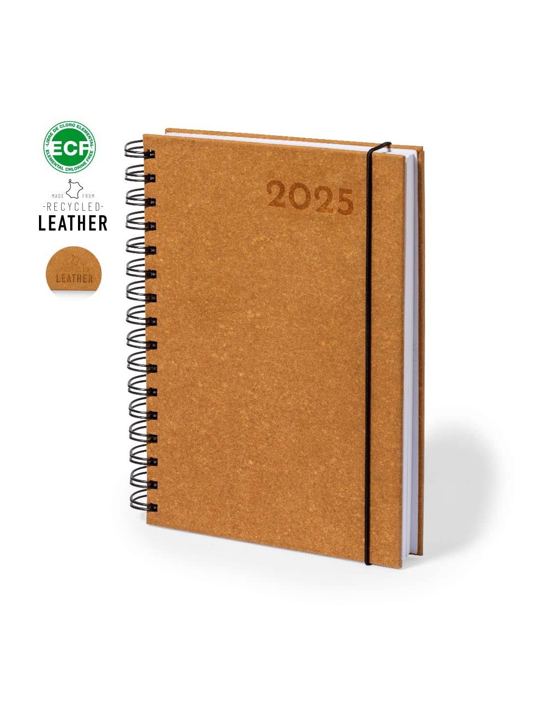 Agenda de tamaño A5 fabricada en elegante y sostenible cuero reciclado. Con cubiertas rígidas y elástico de cierre. Con distintivo cuero reciclado. Diseño página día, zona de anotaciones por día y páginas con esquina troquelada para marcar el día. En 2 idiomas: castellano e inglés. Presentado en caja kraft. El cuero reciclado rescata las fibras desechadas en los procesos de fabricación del cuero, minimizando el desperdicio de material, contribuyendo a reducir el impacto ambiental y manteniendo a la vez sus propiedades originales.