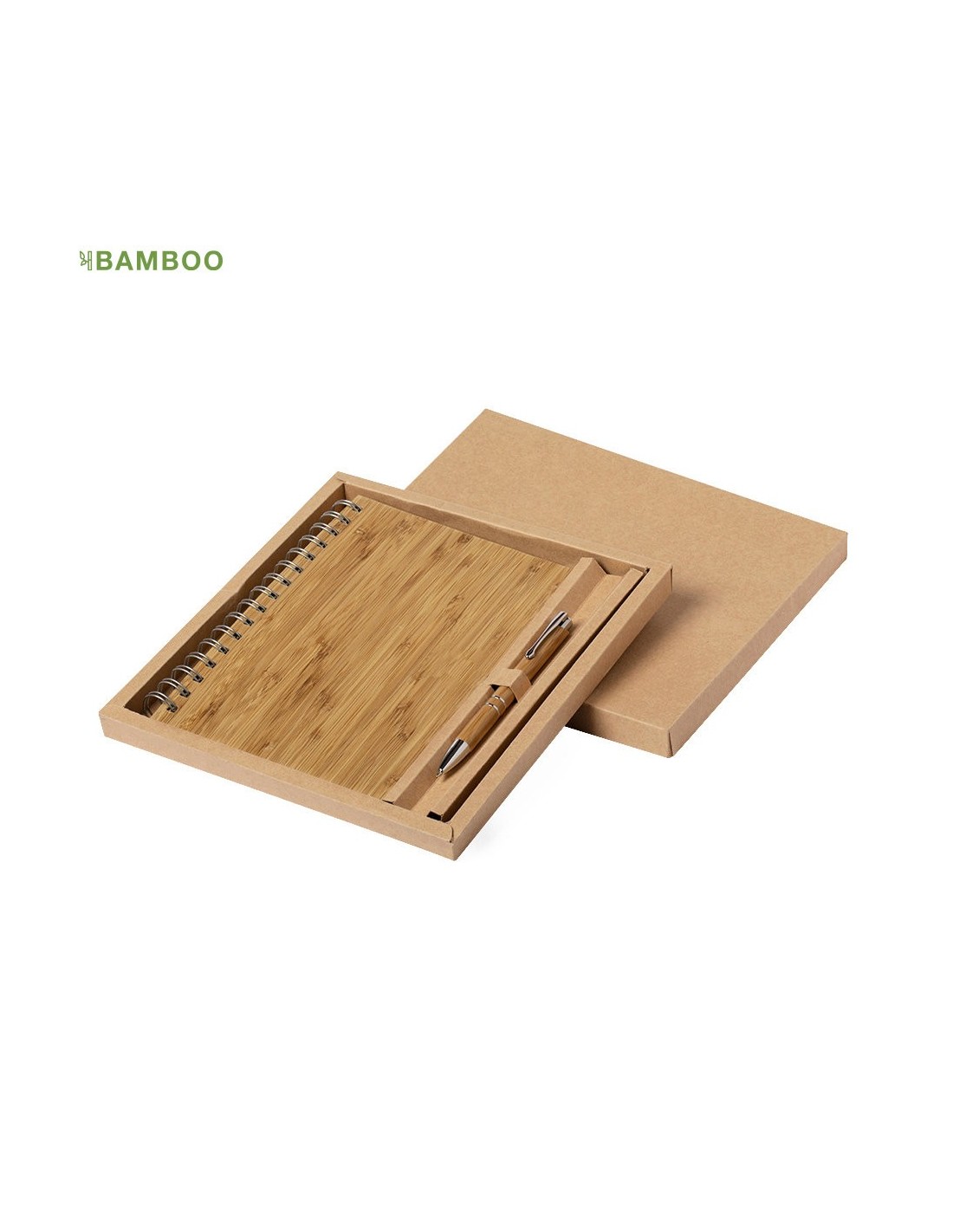 Set de libreta y bolígrafo en línea nature. Incluye libreta de anillas con tapas rígidas en bambú, con 80 hojas de disposición a una raya y diseño eco. Bolígrafo de mecanismo pulsador, con cuerpo en bambú y accesorios metálicos -cartucho jumbo y tinta negra-. Presentado en estuche de cartón troquelado y diseño eco.