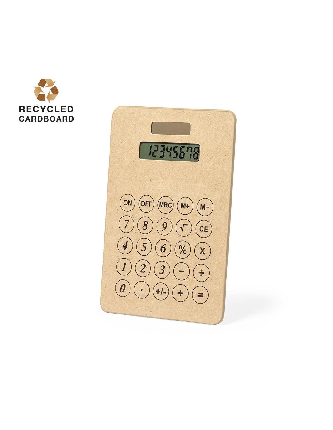 Calculadora de 8 dígitos de línea nature. Fabricada en cartón reciclado y funcionamiento con energía solar. Pantalla LCD y mecanismo de apagado automático. Presentada en caja individual de diseño kraft.