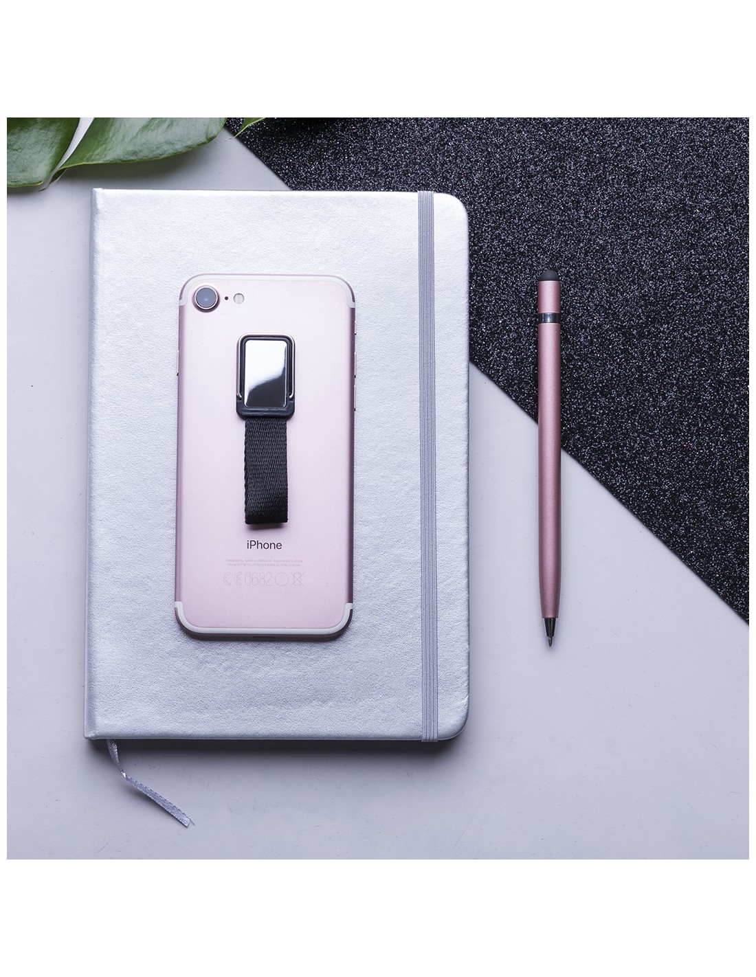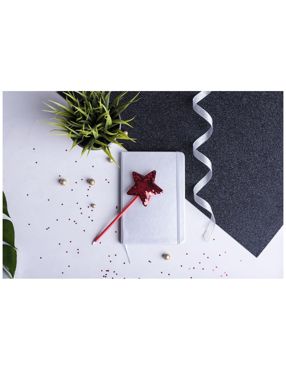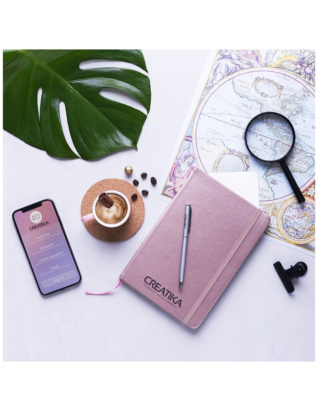 Bloc de notas en polipiel de llamativos colores metalizados. Disponible en colores dorado, plateado y oro rosa. Con tapas rígidas, elástico de sujeción y marcapáginas de tela a juego. Incluye 80 hojas lisas con acabado en color natural.