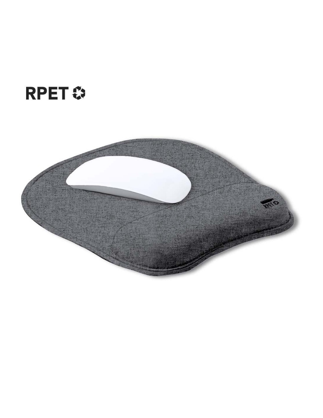 Alfombrilla para ratón fabricada en suave poliéster RPET, elaborado a partir de plástico reciclado para así fomentar la reutilización de residuos plásticos y ayudar a la sostenibilidad del planeta. Con base antideslizante en silicona y reposa muñecas acolchado para prevenir el estrés y el dolor en las articulaciones. Distintivo RPET impreso.