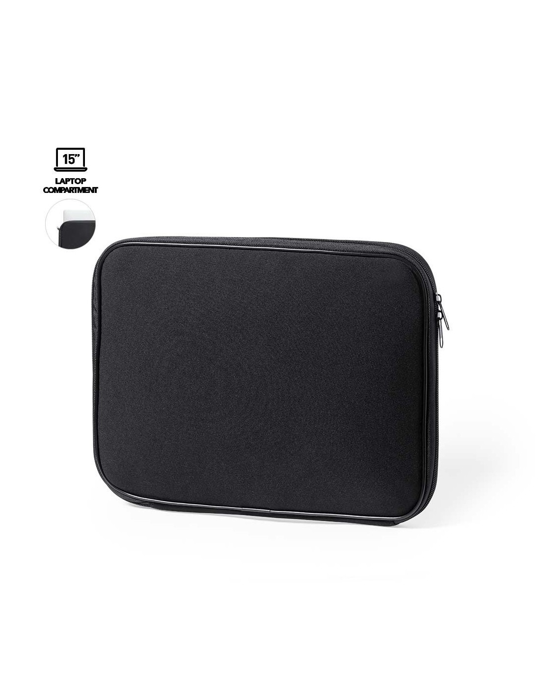 Funda para ordenador portátil, fabricada en resistente soft shell. En elegante color negro, con interior acolchado. Cierre de cremallera a juego con doble tirador. Para ordenador portátil o tablet de hasta 15 pulgadas.