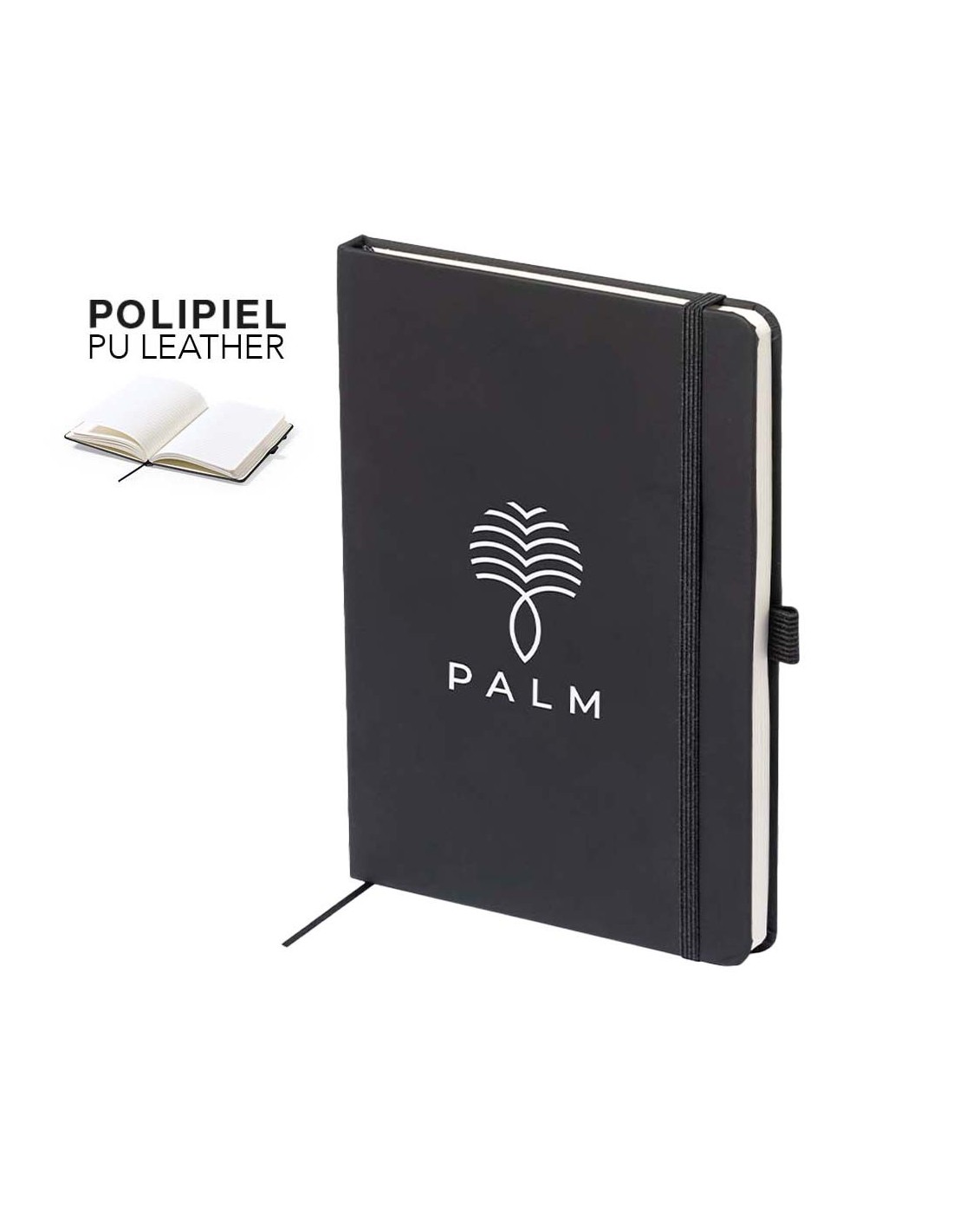 Bloc de notas fabricado en polipiel de elegante acabado en negro. Con tapas duras, marcapáginas y elástico de sujeción a juego. Interior con 100 hojas de disposición a 1 raya y soporte para bolígrafo (bolígrafo no incluido).