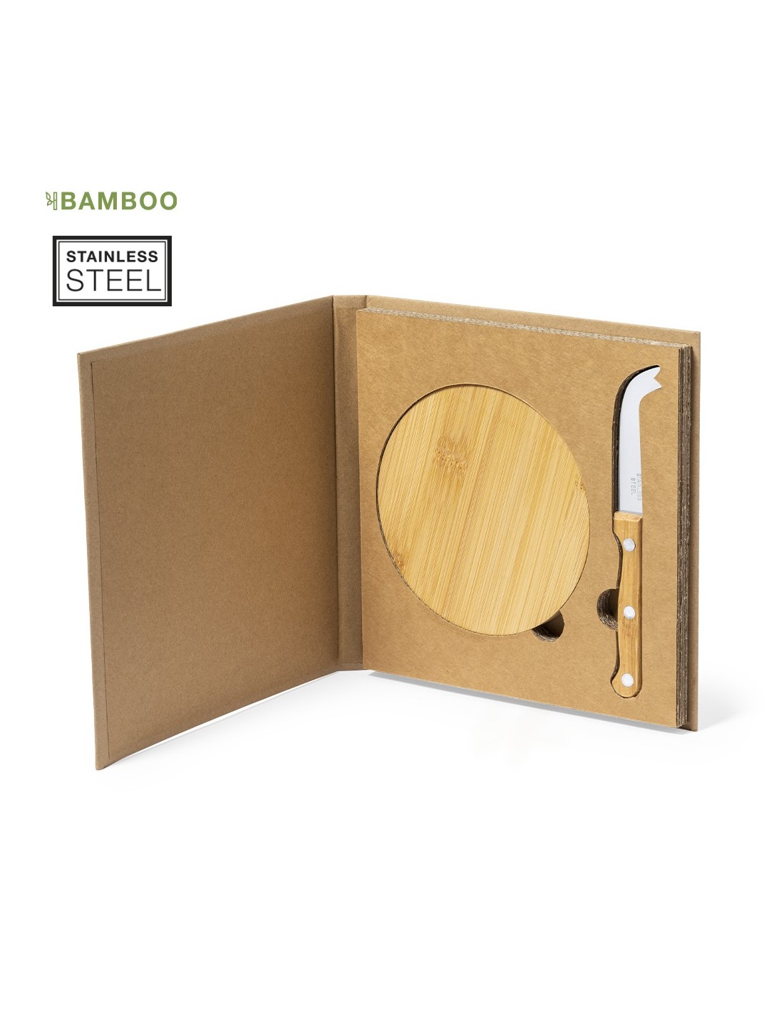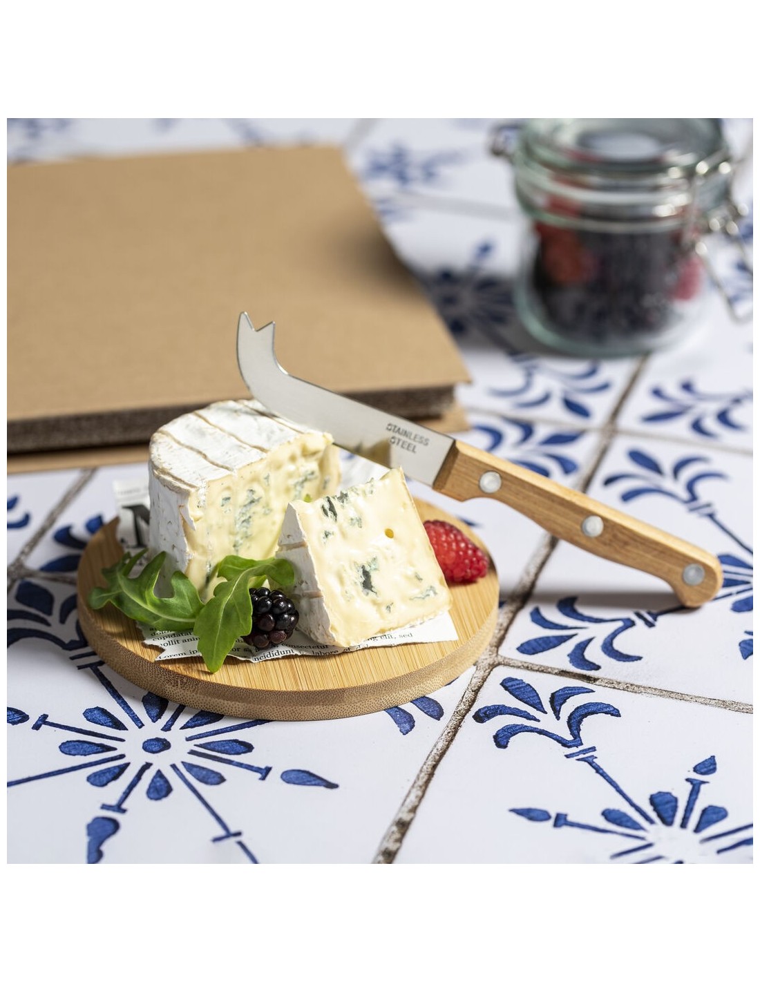 Set de quesos de línea nature, fabricado en bambú y acero inoxidable. Incluye tabla de corte y presentación redonda y cuchillo especial para queso. Presentado en estuche individual troquelado de cartón reciclado acabado kraft.