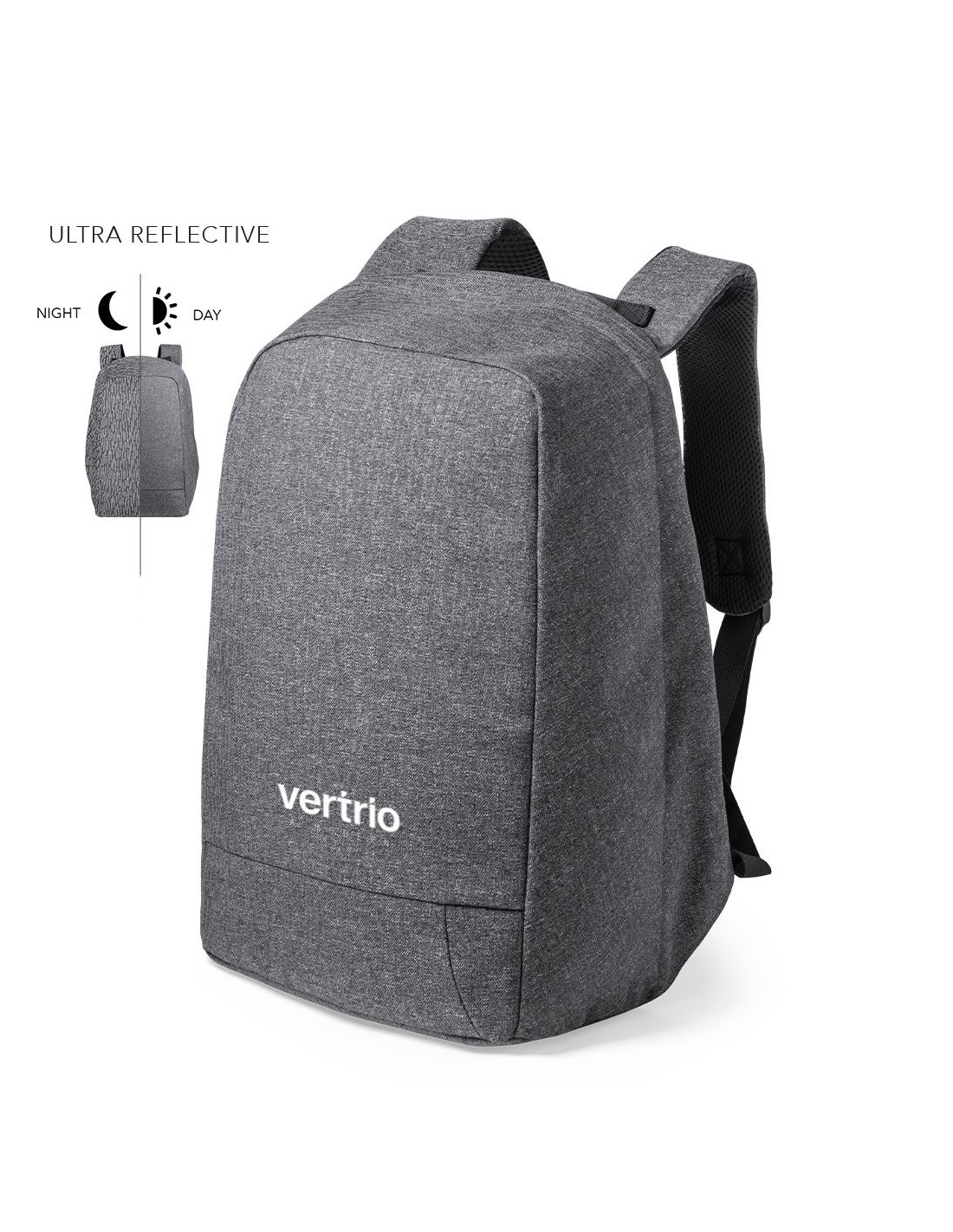 Mochila antirrobo reflectante de alta visibilidad, elaborada en resistente poliéster 600D de calidad premium y acabado en color gris. Fabricada empleando filamentos con gran capacidad para reflejar intensamente la luz, gracias a millones de pigmentos reflectantes y basándose en el principio de la retro-reflexión de la luz, una propiedad de visibilidad nocturna que consiste en la refracción de la luz hacia la fuente de origen de la misma. Resistente a salpicaduras de agua, con bolsillo antirrobo y accesorio para ajuste en trolley. Compartimentos interiores acolchados para ordenador portátil de hasta 15 pulgadas y tablets de hasta 12 pulgadas. Cintas de hombros y espalda acolchadas.