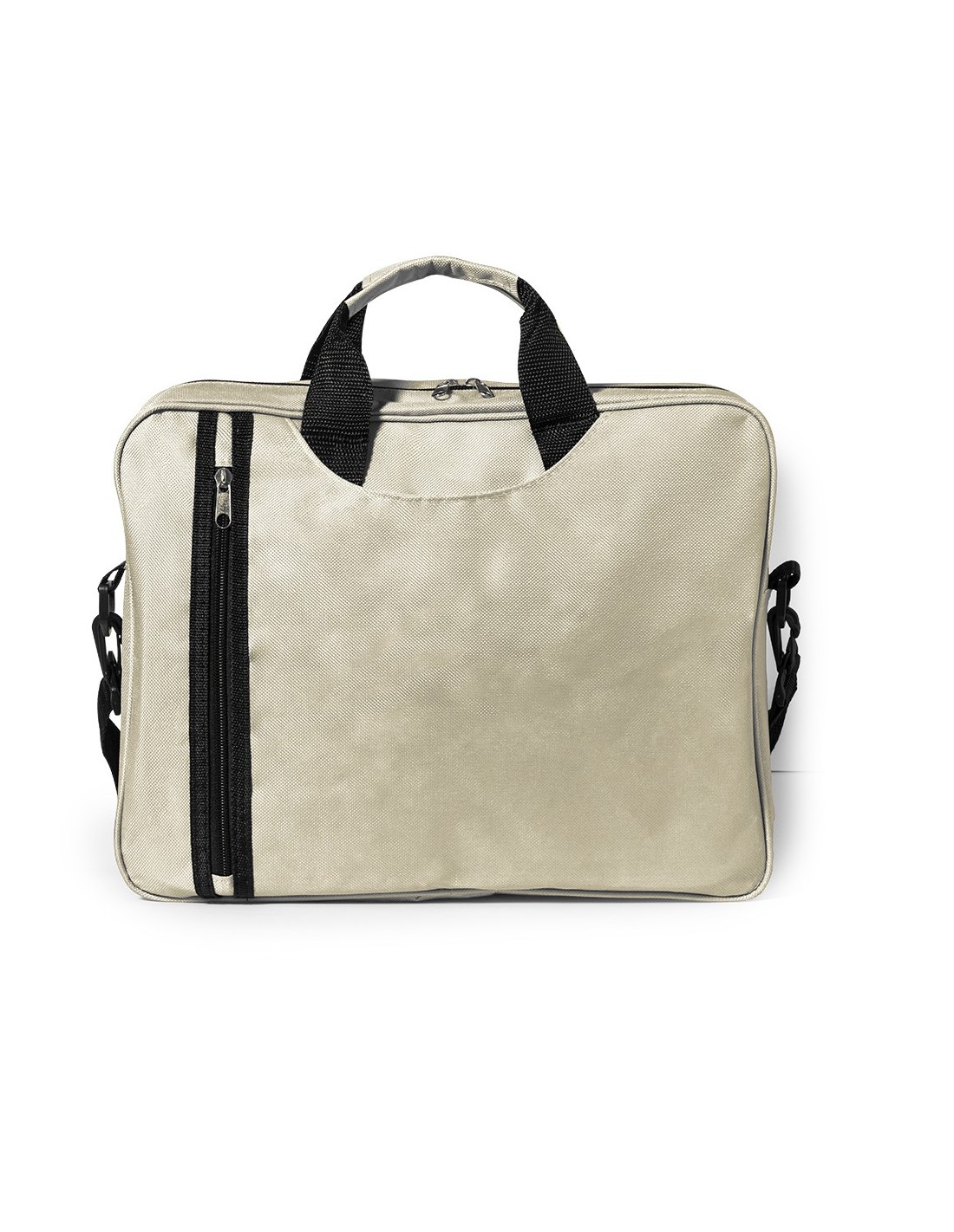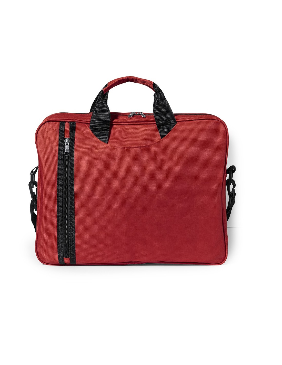 Portadocumentos de cierre de cremallera con original bolsillo frontal en vertical y compartimento bajo las asas en suave acabado de poliéster 600D en vivos colores. Con asas de transporte reforzadas a juego y cinta bandolera ajustable con cierres de mosqu