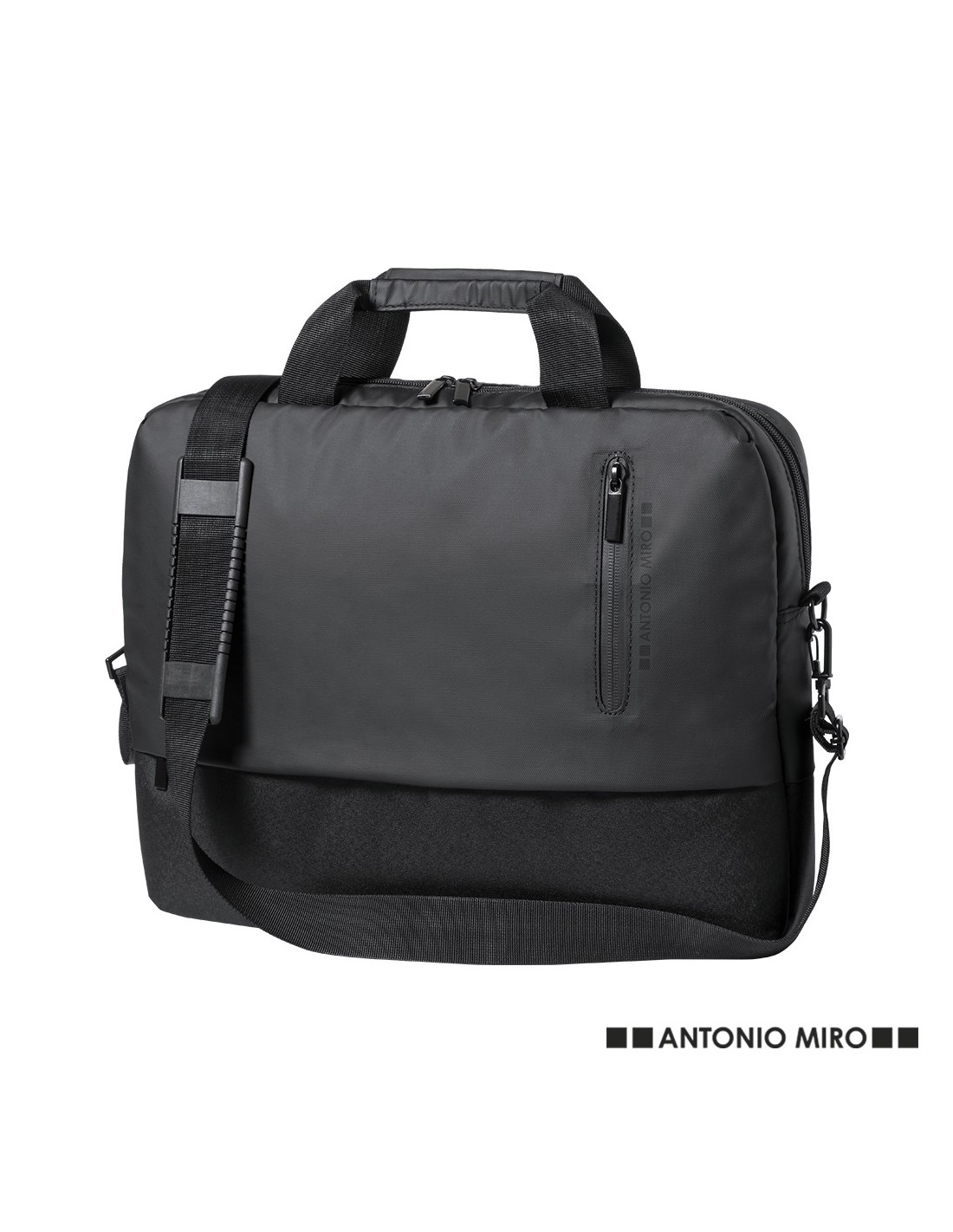 Maletín de Antonio Miró de calidad premium en resistente poliéster 600D. De sobrio diseño y con compartimento acolchado para portátil de hasta 15 pulgadas. Con cómoda asa de transporte reforzada, cierres de cremallera con tiradores metálicos y bolsillo frontal. Logotipo de la marca en frontal.