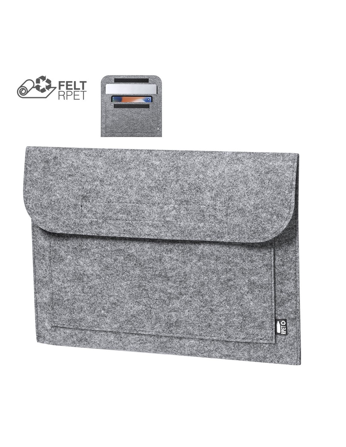 Funda para ordenador portátil de línea nature y en resistente fieltro RPET reciclado, fruto de la combinación del proceso de reciclaje de materiales plásticos junto con la técnica milenaria de fabricación del fieltro, dando como resultado un material de eco-tendencia que, además de ser de origen reciclado, también se convierte en reciclable. Solapa con cierres de velcro y bolsillo frontal, con distintivo RPET en etiqueta exterior.