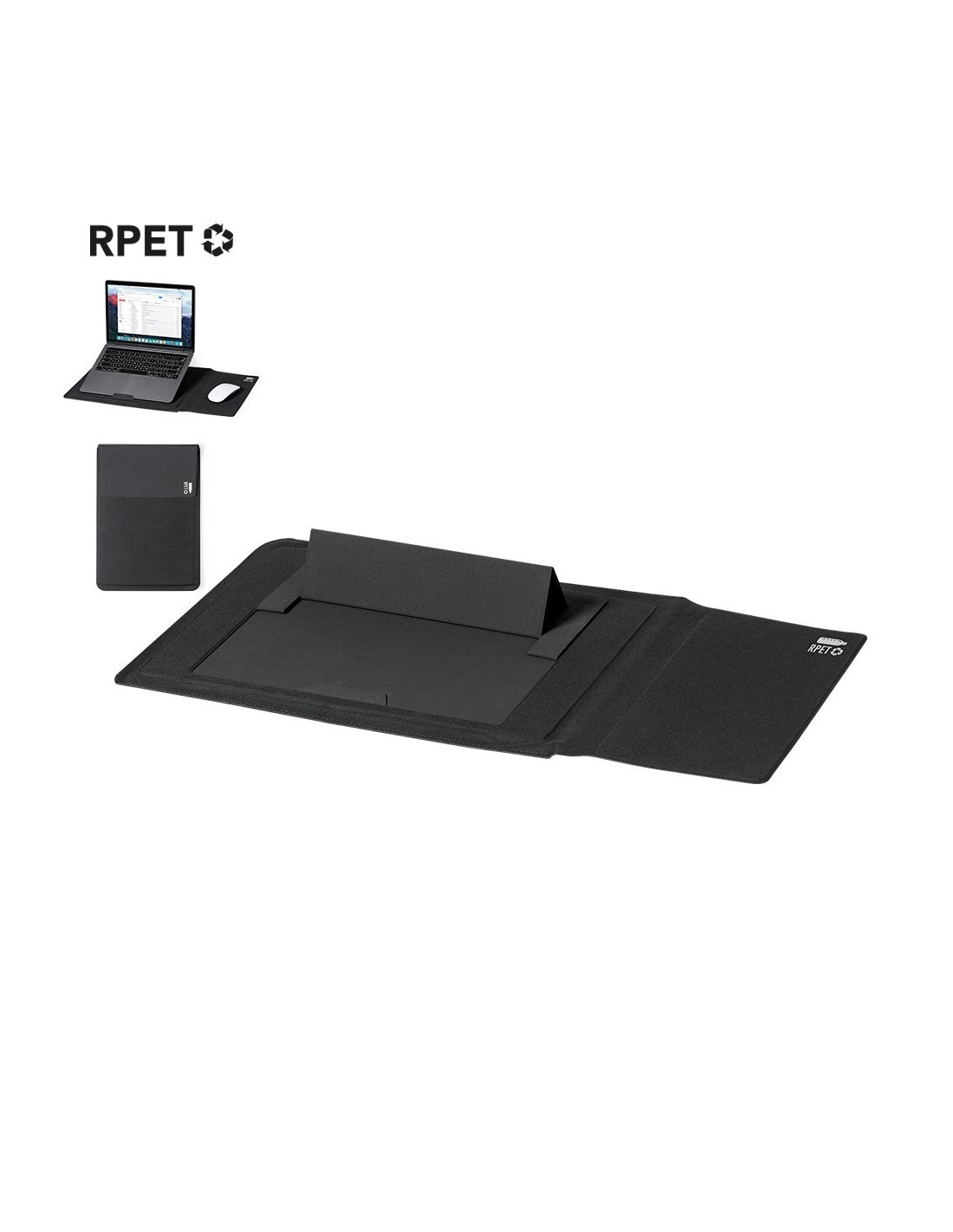 Funda de ordenador fabricada en poliéster 600D RPET, elaborado a partir de plástico reciclado, para así fomentar la reutilización de residuos plásticos y ayudar a la sostenibilidad del planeta. Con cierre magnético y distintivo RPET. Interior desplegable con alfombrilla para ratón y soporte inclinado para ordenador. Presentado en caja individual de diseño.
